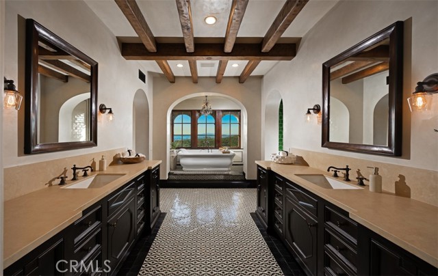 Discovered by invitation only, this Tuscan-inspired Farmhouse estate is a rare legacy property within the exclusive double guard-gated community of Crystal Cove. Set on one of the few coveted double lots in the entire enclave, the estate is situated entirely above grade, elevating sightlines and showcasing expansive ocean views throughout the residence. Constructed by PrideMark and set on over 1.10 acres, the estate unfolds as a true trophy property spanning over 12,000 square feet. Approximately 280 degrees of sweeping ocean views envelop the 10,464 square foot main residence and the 1,883 square foot detached guest house. Anchoring the estate’s exceptional indoor-outdoor lifestyle are four fireplaces—three indoors and one outdoors—along with a fire pit designed for intimate gatherings and elegant entertaining. A gated entry introduces curated design with textured finishes, symmetry, custom built-ins, and refined architectural details. The Great Room frames panoramic ocean views through steel-framed windows, extending toward Palos Verdes and Long Beach. An enclosed indoor/outdoor loggia creates a year-round living and dining retreat. Main-level amenities include an elegant library, mud room, two ensuite bedrooms, two powder rooms, and a spacious laundry suite. The executive office is private and generously sized with commanding ocean, city light, harbor, and courtyard views. A separate gym/flex room with private entry adds versatility. In total, the estate offers six bedrooms and ten bathrooms, including five ensuite bedrooms in the main residence and a detached guest house with one bedroom and two bathrooms, plus an outdoor-access bathroom. The chef’s kitchen features a stone arched hood, Viking range, 36” refrigerator with matching full freezer, custom pantry storage, and a breakfast nook with antique stone fireplace overlooking the gardens. Upstairs, the primary suite enjoys ocean views, a soaking tub framed by brick arches, heated floors, antique Moroccan tile, an oversized closet, and dual showers including steam. Two additional ensuite bedrooms and a media room complete the level. The grounds showcase an infinity-edge pool, putting green, fire pit, built-in BBQ pavilion, and sweeping ocean panoramas. Parking includes six garage spaces plus six additional motor court spaces. The detached guest house offers full residential comfort with elevator access and finishes equal to the main home—ideal for guests, multigenerational living, or staff.