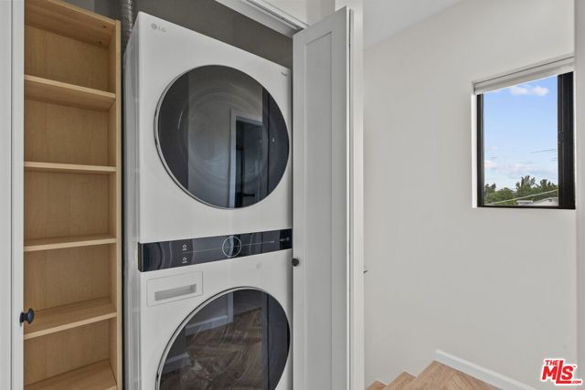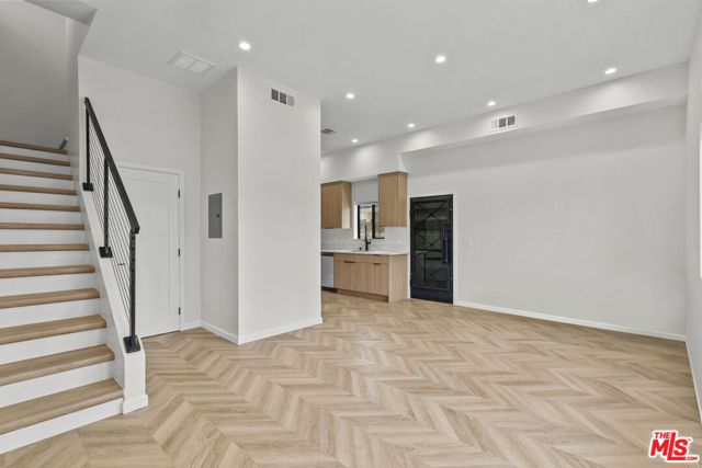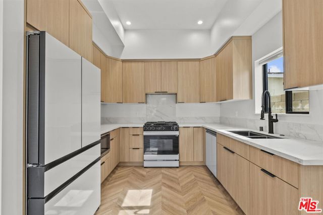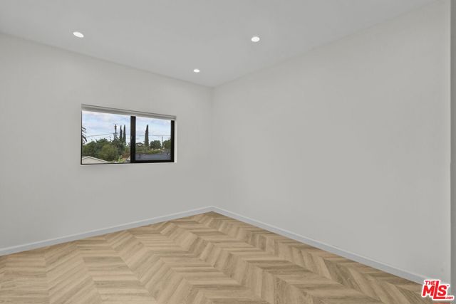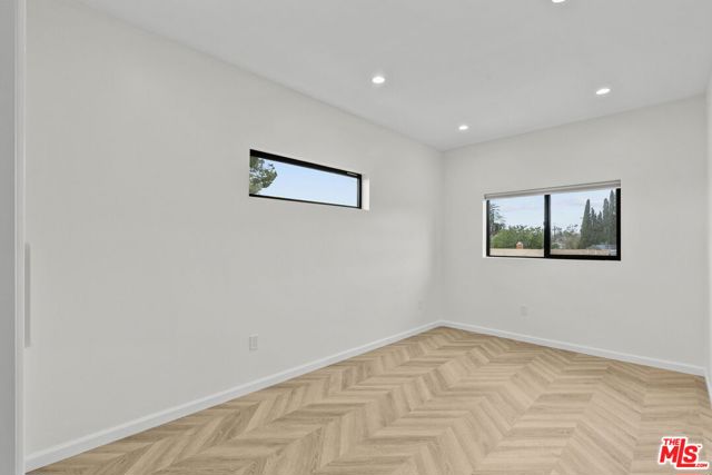 Step into a lifestyle of modern elegance with this newly constructed two story ADU offering approximately 940 square feet of sophisticated living space. Designed with a meticulous eye for detail, the residence welcomes you with soaring nine foot ceilings and recessed lighting that amplify the bright, airy atmosphere. Wide plank herringbone style flooring runs throughout the home, creating a seamless and upscale foundation for any decor. The open concept main level flows effortlessly into a custom designed kitchen featuring sleek cabinetry, quartz countertops, and a designer backsplash. Premium stainless steel appliances, including a full size refrigerator, range, microwave, and dishwasher, make this kitchen as functional as it is beautiful. The contemporary aesthetic continues into the private quarters where both bedrooms feature custom built closets with generous storage. The bathrooms serve as private retreats, appointed with designer tile, frameless glass shower enclosures, matte black accents, and elegant gold fixtures. For ultimate convenience, the home includes an in unit stacked washer and dryer. While this ADU is attached to the main residence, it maintains its own separate entrance and a dedicated front yard area designated exclusively for tenant use. This is a rare opportunity to lease a high quality, newly built home that combines luxury finishes with a thoughtful, functional design in a prime location. Please note that the stated lot size reflects the entire property as no separate land measurement is available for the ADU.