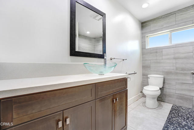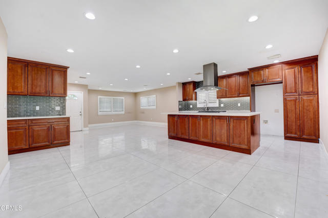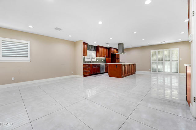 Located in the highly sought-after neighborhood of South Granada Hills, this spacious 4-bedroom, 2-bathroom home seamlessly blends modern upgrades with comfortable living. Step inside to an open-concept floor plan featuring glossy oversized tile flooring, recessed lighting, and a beautifully updated kitchen equipped with rich wood cabinetry, a sleek glass tile backsplash, stainless steel appliances, and a large center island perfect for entertaining. The expansive living and dining area flows effortlessly to the backyard through sliding glass doors that lead to a covered patio with views of a serene fountain centerpiece and a built-in outdoor barbecue area--ideal for alfresco dining.The home offers four generously sized bedrooms, including one with a bold accent wall and ceiling fan, and two well-appointed bathrooms--one with a modern walk-in shower and vessel sink, and the other with classic tiled finishes and ample storage. Additional highlights include dual-pane windows with plantation shutters, central HVAC, and a two-car attached garage. With charming curb appeal shaded by a mature tree and a backyard designed for gatherings, this move-in-ready property is a fantastic opportunity to enjoy peaceful suburban living with easy access to top-rated schools, parks, and freeways.