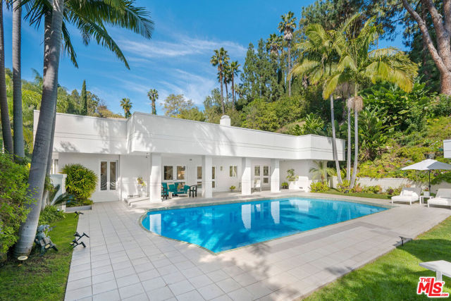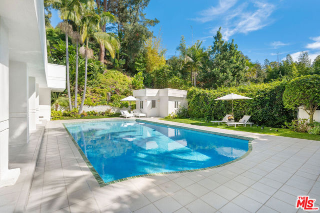 BEVERLY HILLS PROPER. Completely reimagined in 2026 and privately tucked behind tall hedges and gates on one of the most desirable streets in Beverly Hills, this Art Deco estate offers exceptional scale and privacy. Originally designed and built by renowned Hollywood couture designer Dina Barel, the home reflects timeless design and thoughtful attention to detail throughout. Set on over half an acre of landscaped grounds, the property blends classic architecture with a layout that feels functional and inviting. High ceilings, skylights, and French doors fill the home with natural light, while quality finishes add warmth and polish. The main level is ideal for entertaining, featuring a well-appointed kitchen with high-end appliances, custom cabinetry, and a large island that opens to the dining area and wet bar, all with direct access to the backyard. Outside, a pool and spa, natural waterfall, mature palms, and multiple seating areas create a private setting perfect for both relaxing and hosting. Upstairs, the primary suite includes a fireplace, dual dressing areas, and spacious bathrooms with a soaking tub and steam shower. Additional bedrooms are bright and generously sized, complemented by a lounge area and separate staircase for added flexibility. A rare opportunity in a premier Beverly Hills location, this home offers privacy, quality, and timeless appeal, ready for its next owner to enjoy.