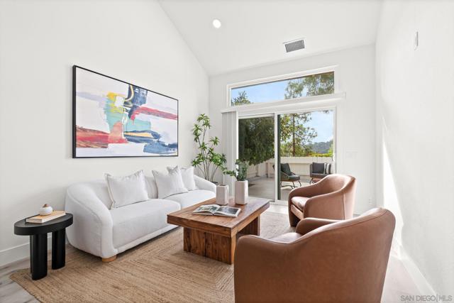 Welcome to your beautifully upgraded turn-key end-unit townhome, ready for you to move right in. Step outside to a bright, south-facing patio—newly tiled and perfectly elevated above the walking paths. Enjoy serene views of park-like pine trees and the rolling canyons and hills of Torrey Hills. The modern kitchen features stone countertops, tiled backsplash, and sleek stainless steel appliances—all oriented toward tranquil tree and hillside views. A sliding glass door provides direct access to the patio, ideal for entertaining with drinks and appetizers. The living room boasts vaulted ceilings, recessed lighting, and a cozy fireplace, creating the perfect retreat for winter evenings. It opens seamlessly to the spacious patio and its sun-filled, south-facing vistas. The bathrooms are finished in premium stone and tile, while the primary suite features a luxurious walk-in shower with dual shower heads. Additional highlights include dual-pane windows for superior quiet and insulation, central heating and air conditioning for year-round comfort, and a new energy-efficient on-demand gas water heater. The attached garage offers generous storage space and newly refinished, sealed floors. Enjoy resort-style living with a community pool, spa, and tennis courts, all in a beautifully maintained setting. Located just minutes from the shops and restaurants of Piazza Carmel, One Paseo, and Del Mar Highlands, as well as top-rated schools, the library, recreation center, the SR-56 bike path, and Torrey Pines State Beach. Experience the perfect blend of comfort, style, and location.