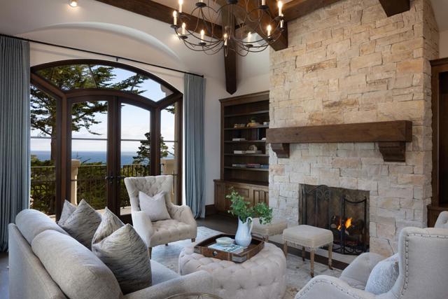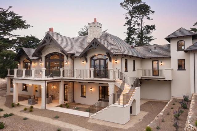 Experience timeless French country elegance at this 6,402+/- sq.ft. estate in Pebble Beach, crafted by Randy Wallis and designed by Jun Sillano of IDG. Set on 1.35 acres with panoramic views from Point Lobos to Point Sur in Big Sur and the coastline in between, this 5-bed, 6.5-bath home offers refined living in a private coastal setting. The stone entry opens to a grand living room with wide-plank wood floors, oak built-ins, and Ironware chandeliers. The gourmet kitchen features honed marble counters, Thermador appliances, a wood-clad hood, and walk-in pantry, all adjacent to a cozy family room with fireplace. A main-level primary suite includes French doors to the deck, walk-in closets, and a spa-like bath with Palomino granite and walk-out patio. Other features include an elevator connecting the main levels, a guest suite with ocean views, and a lower level with game room, multiple ensuite bedrooms, laundry, and radiant heat throughout. The 920+/- sq.ft. 3-car garage has dual EV chargers. Exterior highlights include fire pit, ocean-facing deck, uplighting, bronze railings, and room for a pool or guest unit. Quietly nestled among oaks with privacy and potential for expansion, this is Pebble Beach luxury at its finest.