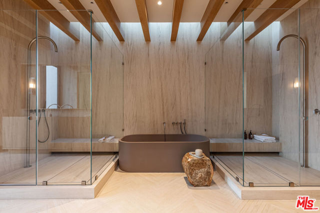 Welcome to "Five Fathoms" the latest creation by celebrity designer Jae Omar and architect Eran Gispan. A residence of timeless beauty and organic architecture, it is set on a nearly 21,000 square foot lot. This 9,800 square foot residence unfolds across five distinct structures, thoughtfully connected by glass-encased walkways that "float" over meandering waterways. The interior aesthetic showcases Omar's signature "organic modern" approach, featuring a textural symphony of sandblasted stone, vanishing walls of glass, and meticulously crafted white oak accents that converge in perfect harmony. The primary suite stands as a singular retreat, complete with a private library, a vast deck, and an ethereal, stone-wrapped bathroom that is cloaked in natural light from strategic skylights that continue into the custom walk-in closets. Additional features include an ADU conceived as a serene wellness retreat, a 65-foot swimming pool adorned with a grand spa and cold plunge, expansive cobblestone terraces, multiple outdoor fireplaces, a fully equipped alfresco kitchen, a state-of-the-art Dolby theatre, and a cutting-edge security system with voice-activated infrared technology. A legacy of contemporary design and luxury living. Dream big, live bigger at "Five Fathoms."