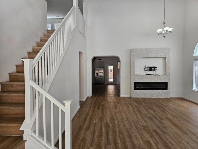 Homes of this size are rarely available in this area. Located in Santa Nella, this spacious 5-bedroom residence features a 3-car garage, formal living and dining rooms, and a primary suite on each floor. The large upstairs loft offers versatile space for a home office, playroom, or lounge. Recent upgrades include brand-new flooring, beautiful hardwood laminate throughout, and stunning white quartz countertops with full-length backsplashes. The kitchen is complemented by custom dark-tone cabinets and elegant, updated lighting fixtures. Upon entry, youre welcomed by a gorgeous fireplace with a custom stacked-stone mantel and convenient TV hookups, creating a warm and inviting focal point. The primary bathroom is designed for comfort, featuring dual sinks, a standalone shower, and an oversized soaking tub. Storage is abundant, with ample cabinetry and a massive three-car garage to accommodate hobbies, tools, and seasonal items. Situated on a corner lot, the backyard is an entertainers dream with custom pavers, a large covered patio with power and lighting, and low-maintenance synthetic turf that stays green year-round. Conveniently located near I-5 and Highway 152, this home is ideal for commuters looking to stay close to Los Banos while enjoying easier access to the Bay Area.