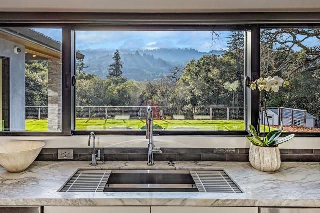 Contemporary single-level main residence with attached two-story ADU on 1.1+ private acres finished in 2021, offering direct Windy Hill views and walking distance to Portola Valley Town Center, library, restaurants, farmers market, and trailheads. Striking modern architecture features walls of glass, soaring ceilings, skylights, and white oak floors throughout. The dramatic great room opens to covered and open terraces and a level lawn just off the living room patio, with rear grounds anchored by a heritage oak. The designer kitchen showcases Calacatta marble surfaces, a waterfall island, and high-end appliances. The main residence includes a dedicated office, four bedrooms, and three and a half baths, highlighted by a serene primary suite with Windy Hill views and a Zen-inspired bath with private garden. A privately located bedroom suite is ideal for guests or an au pair. The attached ADU offers one bedroom, one bath, a full kitchen, and a living room with fireplace, with finishes matching the main home. Gated entry, custom pavers, cedar entry door, fountains, mature landscaping, level synthetic lawn, raised garden beds, and fully fenced grounds complete this desirable property. Total Finished square footage: 4,390 sq. ft. (main house: 3,520 sq. ft. and ADU: 870 sq. ft.)