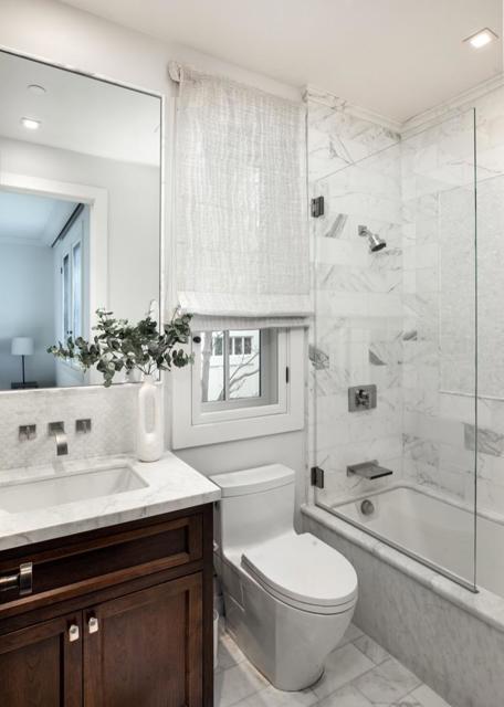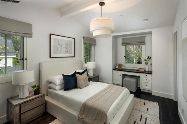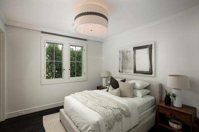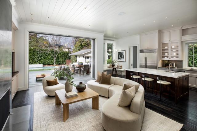 Rarely available, exceptional custom home by renowned Lencioni Construction, completed in 2013 on a premier street. Automated concealed shades, classic interior wooden screens, hardwood floors, designer lighting, and natural stone surfaces create a refined, aesthetic throughout the two-story floor plan. The heart of the home is a stunning kitchen and family room combination featuring 11' ceilings, custom cabinetry, quartz counters, a Carrara marble island, professional-grade appliances including dual dishwashers, banquette seating, gas fireplace, stacking glass doors that retract into the wall for the ultimate seamless indoor-outdoor living. Formal living and dining rooms are complemented by a butlers pantry with wine storage and huge walk-in pantry with additional refrigerator. The main-level primary suite offers French doors to the grounds, a customized walk-in closet, and a luxurious marble bath with heated floors, soaking tub, steam shower, and automated shades. A second main-level suite and two upstairs suites with marble baths surround a central lounge. Beautiful yard with, pool/spa with cover, built-in barbecue, fire pit and privacy.All in a Premier West Menlo Park location, surrounded by estate homes, close proximity to Stanford University, downtown, excellent schools.