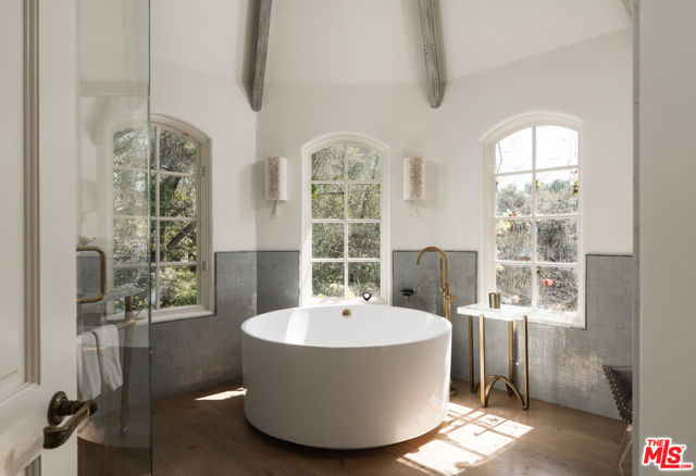 Moments from Montecito's Upper Village, return to your own private fairytale estate. Tucked along a charming lane in a coveted location, the property offers the rare balance of convenience and seclusion. The residence is defined by a stone exterior, slate rooflines, soaring cathedral ceilings, custom millwork, and multiple romantic fireplaces. In the kitchen, hand-hewn beams reclaimed from a 300-year-old European barn bring warmth and quiet character. 5 bedroom suites are thoughtfully arranged on a single level, while a top-floor media lounge with full kitchen & bath creates an ideal retreat for guests or relaxed entertaining. Across 1.49 gated acres, the grounds feature mature elm trees, lawns, converted barn, & a bocce court, along with approved plans for a future pool & cabana.