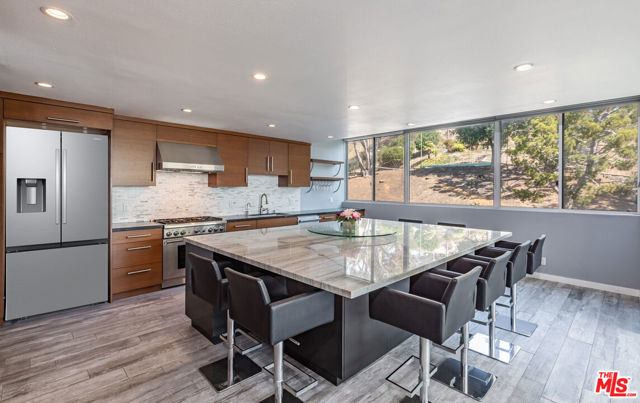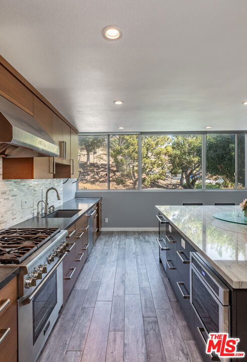 Perched above the Pacific at the iconic Edgewater Towers, this reimagined 2-bed, 2-bath coastal retreat spans 1,261 sq ft of light-filled living space with breathtaking ocean, mountain, and treetop views. Large windows that slide open invite in the ocean breeze, bathing the open-concept interiors in natural light. The sleek modern kitchen features rich cabinetry, quartz countertops, and an oversized waterfall island flowing effortlessly into the spacious living area anchored by a sculptural concrete fireplace. Both bathrooms have been tastefully redesigned with refined finishes, creating a timeless, elevated aesthetic throughout.Set on nine acres of lush blufftop grounds, Edgewater Towers offers resort-style living with 24-hour guard-gated security, two saltwater pools and spas, a fitness center, tennis and basketball courts, private hiking trails, BBQ areas, and manicured gardens all moments from the beach and Palisades Village. A rare opportunity to experience California coastal living at its finest. Moments from the best shops, beaches, and restaurants at the Palisades Village, Malibu, Rustic Canyon, and more!