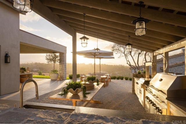 A masterful expression of timeless French country elegance, 17845 Via De Fortuna is meticulously rebuilt from the ground up to reflect the artistry and craftsmanship of a historic European manor. Set on 3.66 acres in the prestigious Rancho Santa Fe Covenant, this 10,363 sq. ft. masterpiece boasts 5 bedrooms, 5 full and 3 half baths, including a dedicated office and detached guest house. From the moment you arrive, the estate’s hand-selected antique barrel roof tiles from the South of France, signal an extraordinary level of detail. Antique oak beams, while hand-forged steel-framed windows and doors flood the home with natural light. The great room, anchored by a custom fireplace lined with reclaimed black firebrick, flows effortlessly into the exquisite Christopher Peacock kitchen, where La Cornue and Miele appliances, hand-painted cabinetry, and Afyon white marble countertops create a space that is as functional as it is breathtaking. The primary suite is a serene escape, offering a spa-inspired bath wrapped in Michelangelo marble, a deep soaking tub, and sweeping views of the lush gardens beyond. The outdoor spaces are a dream come true, where the estate’s natural beauty comes to life. A French village water basin turned fountain and the zero-edge pool and spa with the picturesque backdrop of the majestic Black Mountains create an unparalleled sense of tranquility. The outdoor kitchen, featuring a Kalamazoo grill, is perfect for al fresco dining under the stars, while a porch swing tucked behind the guest house invites moments of quiet reflection. The estate is offered fully furnished, with each piece thoughtfully curated to complement the home’s aesthetic. With state-of-the-art technology, including Lutron smart home automation, owned solar, Tesla backup batteries, and a comprehensive security system, this estate delivers unparalleled functionality alongside its exquisite design.