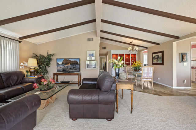 DO NOT DISTURB OWNER PRIOR TO NOON, ANY DAY! Date Palm CC to approve buyer(s) for occupancy prior to offer being reviewed. This home is a triple wide Mobile Home on a large corner lot next to the Community pool, spa and recreation room. . The home is unique in the quality construction with a separate kitchen and breakfast area. The large living room has new flooring, vaulted ceilings and a view to the golf course. The laundry room and bedrooms are large with new flooring, Improvements include new piping in the foundation area of the home with the air conditioner and roof replaced within the last few years. This is a 2 bedroom, 2 bath home of 1,632 square feet built in 1984. The yard is mostly fenced with 5 fruit trees, landscaped and offering golf course views of the 6th green. From anywhere on the property you will have panoramic views to the North/West. The sale is offered Turnkey furnished! SEE DOCUMENTS!