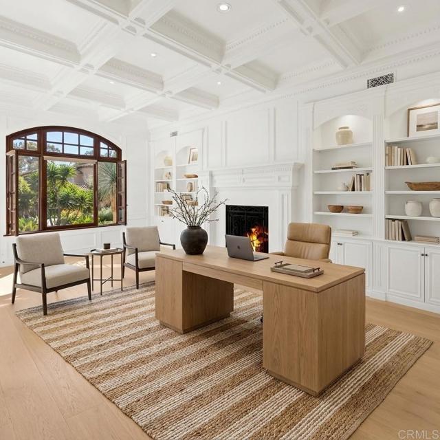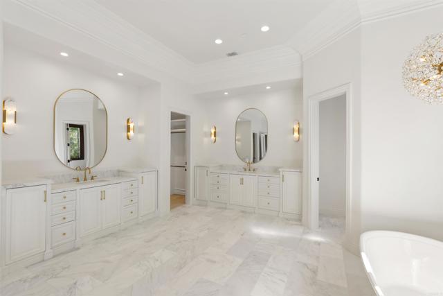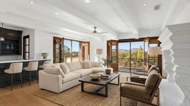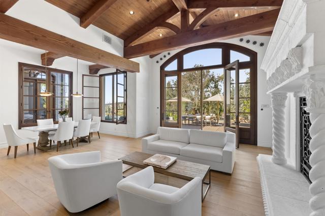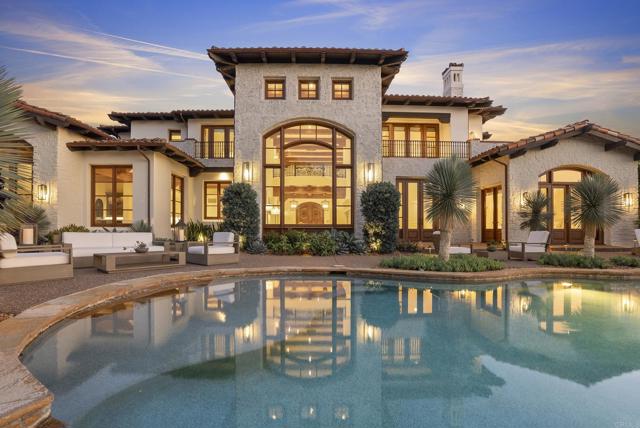 This stunning 5+ bedroom modern European estate offers an expansive view that overlooks the 9th Fairway and iconic clubhouse within the prestigious guard-gated community of The Bridges in Rancho Santa Fe. Extensively remodeled, completed in 2025, the 8,900+sqft residence captures the essence of refined living with a seamless blend of craftsmanship, comfort, and design—all framed by one of the community’s most sought-after views. Inside, natural light pours through expansive windows and French doors that open to the golf course, creating a perfect indoor/outdoor connection ideal for both daily living and entertaining. Every finish was chosen with care—from hand-finished limewashed fireplaces and European white-oak floors to Italian marble countertops, burnished-brass fixtures, and designer lighting. The reimagined kitchen serves as the heart of the home with a farmhouse-style sink, premium appliances, oversized walk-in pantry, bar, and temperature-controlled wine cellar that make entertaining effortless. Additional spaces include a built-out home theater, elegant office, and a separate guest wing with private access that offers versatility for guests, multigenerational living, or creative use. The primary suite is a true retreat, featuring a newly remodeled bathroom in Italian marble with dual vanities, a freestanding soaking tub, and spa-like tranquility. Outside, the lush grounds create a resort-like backdrop for year-round living with a saltwater pool and spa, built-in BBQ bar, and sweeping fairway views framed by golden evening light over the clubhouse. Set within one of Rancho Santa Fe’s most desirable golf communities, residents of The Bridges enjoy world-class amenities, fine dining, and 24-hour security—all just minutes from Rancho Santa Fe Village, top-rated schools, and the coastal towns of Del Mar, Solana Beach and Encinitas.