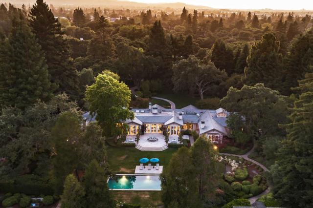 Tucked behind gates on over 2.3 acres, this stunning estate of nearly 7,700 sf offers rare scale, privacy, and resort-like luxury. A long driveway leads to a grand motor court, where towering double doors open to soaring interiors filled with natural light, hardwood floors, and refined stone finishes. The home balances everyday comfort with impressive entertaining space, with expansive gathering areas, a gourmet kitchen, fireplaces, and a private executive office. Four spacious bedrooms anchor the main residence, including a palatial primary suite with a spa-inspired bath. The grounds are equally impressive, featuring sweeping lawns, a spectacular pool, sun-drenched terraces, and multiple areas to relax and entertain. A stylish pool house includes its own guest suite for extended stays, while a separate wine building evokes the charm of a boutique Napa tasting room. This private retreat is minutes from downtown Menlo Park and Palo Alto, Stanford University, and Sand Hill Road.