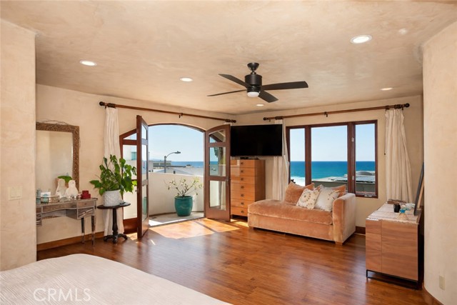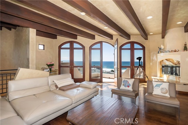 Extraordinary Coastal Living with Breathtaking Ocean Views and Privacy! Discover a rare opportunity to live at this Attractive South-facing walk-street Masterpiece in the heart of Manhattan Beach, just steps from the sand. This Architecturally striking property offers Unobstructed White Water Ocean Views from Palos Verdes to Catalina Island to Malibu — a true sanctuary for those seeking the Ultimate in Coastal Luxury. The expansive living room is framed by exposed wood beam ceilings and large arched windows that bathe the space in natural light while showcasing panoramic ocean vistas. The custom fireplace adds warmth and charm, while the adjacent dining area creates an inviting space for hosting with the Pacific Ocean as your backdrop. The walls are finished with luxurious Venetian plaster throughout, adding a subtle warmth and attention to detail that elevates the home's sophistication. The chef’s kitchen is a showstopper, featuring marble countertops, sleek European-style cabinetry, and professional-grade Wolf appliances. A stunning outdoor entertainer’s deck is equipped with a built-in BBQ, a lighted fire pit, and comfortable lounge seating — perfect for soaking in golden sunsets over the ocean. The primary suite is a surreal retreat, offering a spacious sitting area, a private ocean-view balcony, and a luxurious spa-style en-suite bath with a soaking tub, walk-in rainfall shower, and custom his-and-hers wardrobes. The Venetian plaster continues in the primary suite, creating a seamless blend of elegance and warmth. Additional highlights include multiple sun-drenched terraces with ocean views, designer fixtures, and high-end finishes throughout. The spacious secondary bedrooms each feature en-suite baths, and the private garage offers ample storage. This is more than a home — it’s a lifestyle. Live the essence of Manhattan Beach with unmatched elegance and coastal charm.