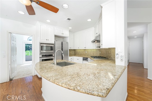 Beautiful 3 bedrooms, approximately 2200 sq.ft. condo new paint and carpet with panoramic view of the golf course, nested in the upscale gated community of Cypress Point, across from the Lake Mission Viejo, where you can enjoy boating , swimming , fishing , various water sports, summer concerts, picnic area and the club house, just like living in a resort. Entering through a low maintenance private courtyard, totally covered by Trex decking. There are only two steps to the classy leaded front door. All of the main living area is on the entry level, the flooring is partially hardwood, the open kitchen is equipped with granite, new Kohler sink, new faucet, garbage disposal. There is a large family room with fireplace and a separate breakfast nook on the main floor. All the bedrooms are downstairs, the third bedroom is currently designed as office and decorated with the most beautiful cabinets, desk and workspace. There is a wraparound deck in front of the living and dining room overlooking the golf course. There also is a patio of the same size down in front of the bedrooms. HOA amenities include pool, spa and a meeting room with kitchen, trash removal. There are two fireplaces: one in the family room and another one in the living room. EXCLUSIONS: