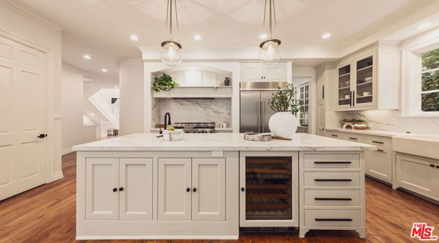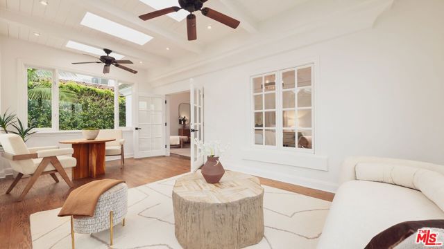 Located North of Montana, this updated three-story Contemporary English residence blends high ceilings, quality finishes, and a functional layout for refined Westside living. A grand foyer introduces elegant formal living and dining rooms, while the updated kitchen with custom cabinetry, wine refrigerator, and breakfast nook opens to a relaxed family room with seamless access to the backyard. The primary suite offers treetop views, high ceilings, a fireplace, sunroom, and a spa-like bath with dual vanities, soaking tub, and generous closets. Additional bedrooms, flexible lower-level living space, and a guest suite provide versatility for modern living. Designed for entertaining, the private backyard features multiple patios, a grassy lawn, pool, and spa surrounded by mature hedges. Ideally located near Montana Avenue, Brentwood Country Mart, and within the Franklin School District, this is a rare opportunity in one of Santa Monica's most coveted neighborhoods.