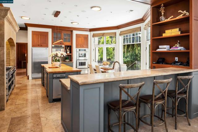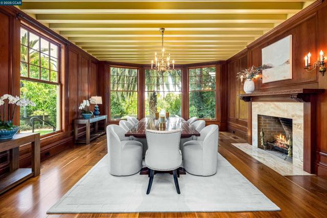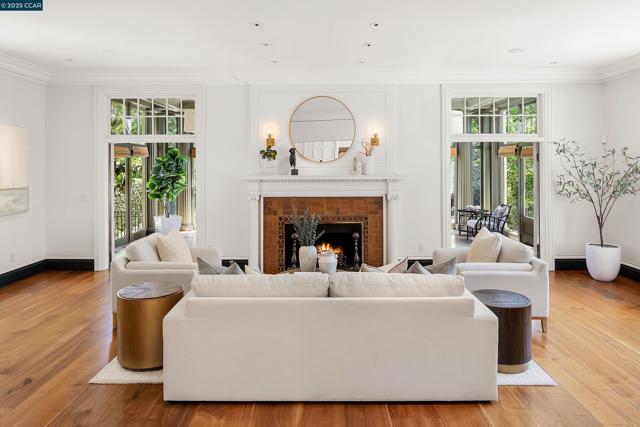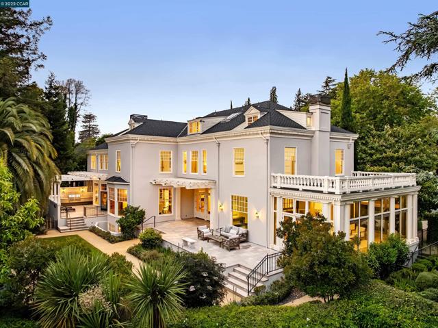 A circular drive leads to an elegant portico framed by Doric columns. Inside, a dramatic foyer with 20-foot ceilings and walnut floors sets a tone of timeless sophistication. The formal living room features a grand wood-burning fireplace, while the adjoining dining room opens to a deck overlooking the gardens. The sunroom, wrapped in floor-to-ceiling windows, fills the home with natural light. The chef’s kitchen offers a hardwood island, dual dishwashers, bar seating, and a sunny breakfast nook. Two staircases and an elevator connect all levels. The expansive primary suite includes a gas fireplace, dual baths, spa tub, and oversized showers. Upstairs, five bedrooms and three baths share a convenient laundry room. A library with fireplace, bright office, and playroom add flexibility. The lower level includes full guest quarters with private entry. Rebuilt in 1999, the home blends classic design with radiant heat, A/C, Lutron lighting, and two garages for ample parking.