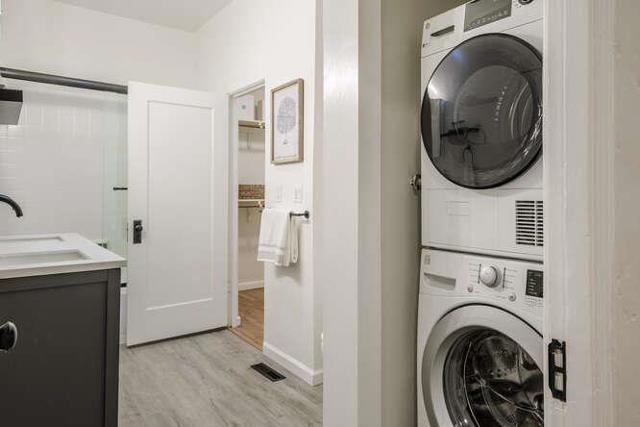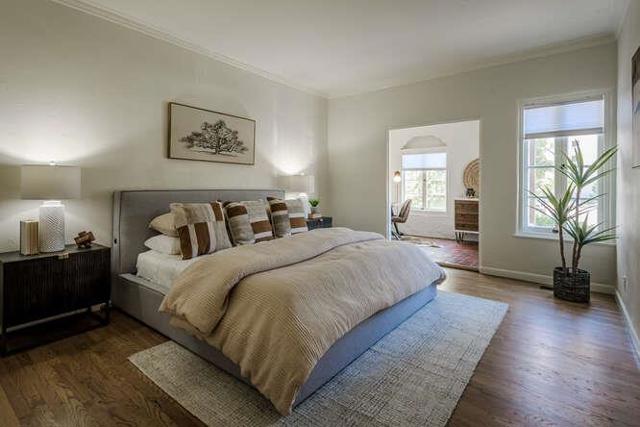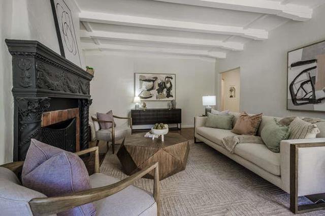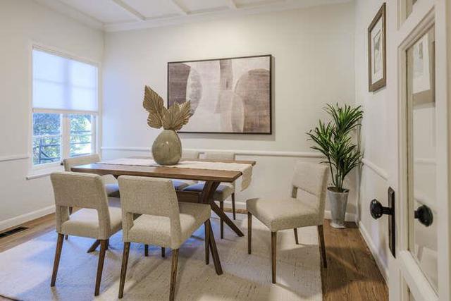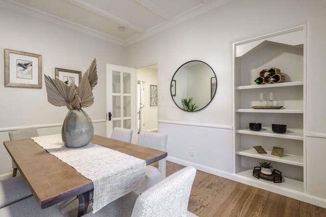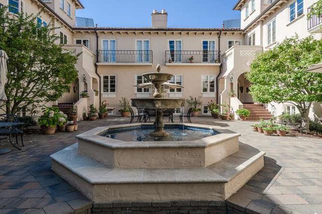 Welcome to this extraordinary 2 bedroom, 2 bathroom condominium located in an elegant Spanish revival style building with a large courtyard and welcoming fountain. Spanning approximately 1,600sf, this unit located on the first floor, offers a blend of comfort and modern amenities. The formal entry with 2 closets leads to the grand living room boasting a striking fireplace and a delightful dining room adjacent to the recently updated kitchen equipped with newer appliances, including a dishwasher, microwave, electric oven range, refrigerator, and a wine refrigerator. The home features high ceilings and beautiful hardwood flooring throughout, adding elegance and warmth to the living spaces. The 2 spacious bedroom suites have ample closet space and one of the bedrooms has a tiled alcove that can be used as an office or workout area. Enjoy cozy evenings by the fireplace, and appreciate the convenience of central air conditioning and heating for year-round comfort. A washer and dryer are included tucked away in the hall bathroom. With one garage space and a separate storage space in the basement, this home offers both practicality and style in a sought-after location in the Baywood neighborhood close to downtown San Mateo.
