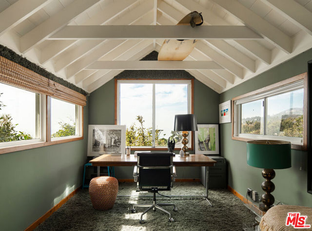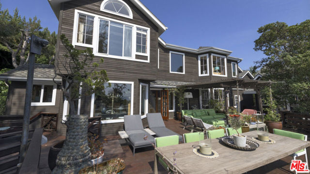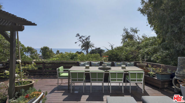 Nestled on a double lot in Western Malibu, this exceptional estate boasts a spacious, light-filled home with soaring ceilings, breathtaking ocean views, and lush landscaping, offering unparalleled privacy. The dual lots create a serene setting around the gated Cape Cod-style main residence and guest house, offering seamless indoor-outdoor entertaining spaces with the sounds of the waves as a backdrop. Inside, steeply pitched plank ceilings, skylights, generous built-ins, large windows, and wood floors define the open-concept design. The welcoming entryway leads to a dramatic two-story living room with ocean views, a cozy fireplace, a charming bay window, and a staircase leading to the upper level. A loft-style hallway lined with windows bathes the central living space in natural light. The adjacent kitchen is an entertainer's dream, featuring greenhouse skylights, stunning garden and ocean views, a glass-topped island with bar seating, premium appliances, an impressive butler's pantry, and a dining area wrapped in windows showcasing breathtaking ocean vistas. Just off the kitchen and living room, a wraparound wood deck offers a seamless extension of the living space, complete with a pergola-shaded lounge, dining area, outdoor sound system, and steps leading to a private courtyard with a hot tub. Upstairs, the home offers three beautiful bedrooms, including a luxurious primary suite with a serene ocean-view sitting area, a walk-in closet/safe room, and a spa-like bath with a free-standing tub. The additional bedrooms each feature bay windows with built-in seating, and one includes a charming ladder-access loft. Across the main-level deck, a separate two-story guest house/studio/office offers soaring wood-plank ceilings, a powder room, breathtaking views, and soundproofed wall is ideal for creative pursuits or work-from-home convenience. Additional highlights include a two-car garage, direct keyed beach access, air conditioning, central vacuum, a security system, and spectacular gardens with a waterfall, koi pond, detached writing studio/office, and meandering pathways. A rare offering, this estate epitomizes gracious living, breathtaking views, and the ultimate in private Malibu luxury.