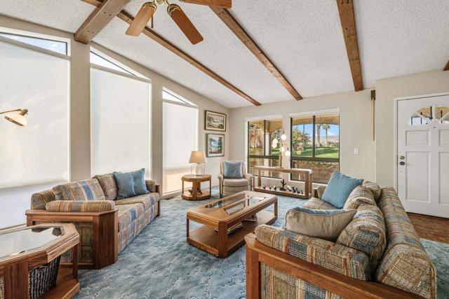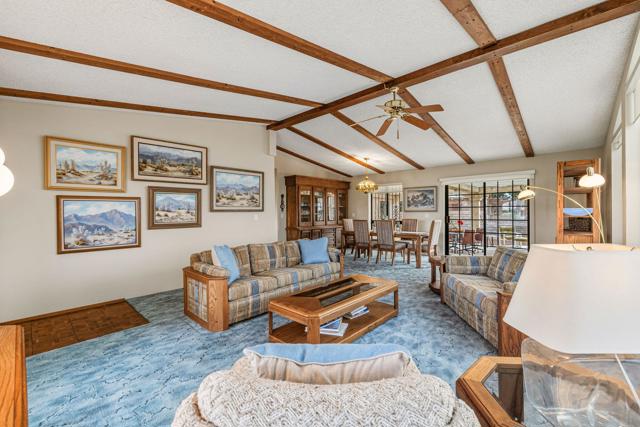 Welcome to this spacious 1,792 sq ft manufactured home situated on owned land at the end of a quiet cul-de-sac, offering exceptional privacy with only one neighboring home. Featuring stucco exterior, durable tile roof and permanent foundation. Perfectly positioned along the Ivey Ranch Golf Course, the property boasts sweeping views of the 1st and 9th fairways, with stunning mountain views to the north and west. Inside, this 2-bedroom, 2-bath home features a layout designed for both comfort and entertaining. The formal living and dining areas showcase vaulted beamed ceilings and floor-to-ceiling picture windows, filling the space with natural light and framing the scenic surroundings. The generous primary suite includes a double-vanity bathroom, for added convenience, and a custom walk-in closet. The spacious kitchen offers a peninsula for extra prep space, or casual dining, and opens to a cozy family room--ideal for hosting or relaxing. Outdoor living is a standout feature with two covered patios, perfect for year-round enjoyment. The detached 2-car garage includes an additional enclosed room that can serve as a potential third bedroom, den, home office, or creative studio. Additional conveniences include a separate indoor laundry and mud room. Security shutters/bars on the windows provide peace of mind for seasonal residents, making this a great home for wintering ''snowbirds''. Updates include new HVAC system (2023), low maintenance desert landscaping, exterior /interior painting, removal of popcorn ceilings in bedrooms, and family room, custom walk-in closet. Located in a desirable gated community, residents enjoy resort-style amenities including a 9-hole golf course, driving range, golf shop, restaurant, four community pools, two spas, pickleball and tennis courts. This home offers the ideal blend of space, views, privacy, and an active lifestyle--don't miss this unique opportunity!
