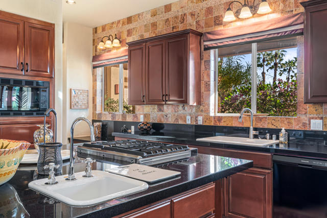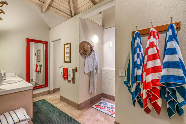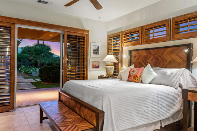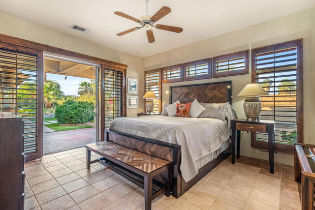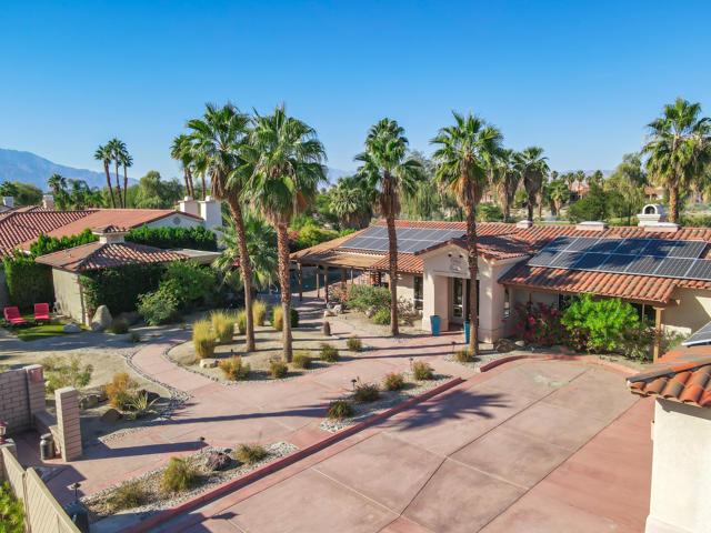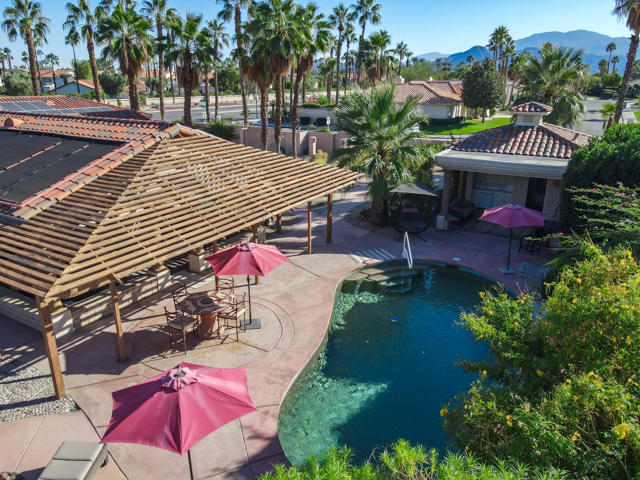 38830 Desert Mirage Drive offers a refined South-facing setting with mountain views, a resort-quality backyard, and a single-level layout that embraces the Palm Desert lifestyle. Set on a generous lot with mature palms and sculpted desert landscaping, the property creates an immediate sense of arrival with wide walkways, warm architectural detail, and a private atmosphere that feels purposeful and serene.Inside, the great room is spacious and filled with natural light from high ceilings, clerestory windows, and multiple sliders that open to the outdoor living spaces. The scale of the room supports both intimate gatherings and larger entertaining, while tile flooring throughout adds comfort and continuity. The kitchen features granite counters, a prep sink on the island, a gas cooktop, and extensive cabinetry, all framed by large windows that overlook the gardens. It connects easily to both indoor and outdoor dining areas, making it ideal for year-round hosting.The home's four bedrooms are positioned together along a dedicated wing, and a separate office offers privacy for work or hobbies. The primary suite enjoys direct access to the backyard, warm wood accents, and a calming connection to the outdoor landscape. Guest rooms are well-proportioned and comfortable for visitors or family.The backyard is the highlight of the property. A South-facing orientation brings steady sunlight throughout the day, creating a vibrant outdoor setting anchored by a Pebble Tec pool with rock waterfall. Multiple lounging and dining areas, covered patios, and open deck spaces support effortless entertaining. A detached pool house with its own shower and toilet adds convenience for guests and elevates the overall outdoor living experience.Additional features include owned solar panels, ample parking, and low-maintenance landscaping. The home is located near Acrisure Arena, Desert Willow Golf Resort, the Cal State San Bernardino Palm Desert campus, and the CV Link pathway, placing recreation, convenience, and entertainment within easy reach.38830 Desert Mirage Drive offers space, privacy, and a resort-style outdoor environment in one of Palm Desert's most accessible locations. It is a compelling opportunity for buyers seeking a home with character, comfort, and a strong connection to the desert lifestyle.