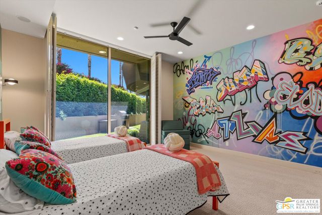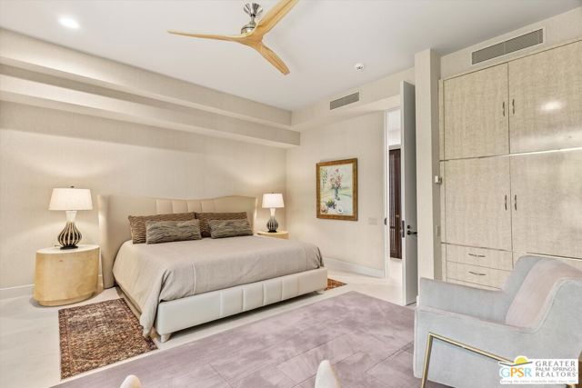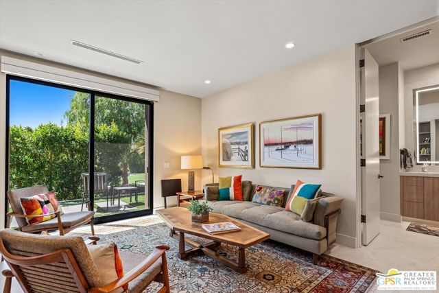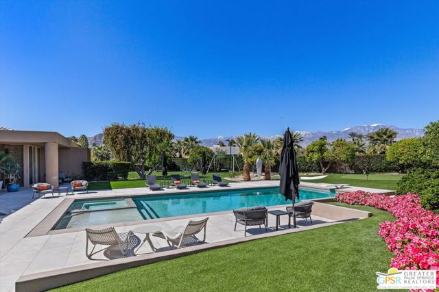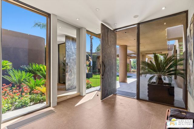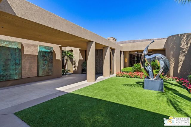 HUGE price reduction and immediate occupancy to personalize in time for this Holiday season. The gourmet Spectrum kitchen, designed for both culinary artistry and grand entertaining, boasts meticulous detailing, including dual islands, double ovens/cooktops, and a thoughtfully integrated coffee and beverage bar, creating a focal point for family gatherings. This ultimate hide and reveal retreat perched like a well-earned trophy inside this exclusively gated "lucky seven" residences of Big Sioux. A masterpiece of design and privacy, this sanctuary is strategically positioned between the iconic Annenberg Sunnyland's estate and Tamarisk Country Club in Rancho Mirage. The expansive single-story zoned layout, encompassing 8,145 sq. ft. residence epitomizes luxury living while its thoughtful design offers an abundance of space and high-end amenities including six bedrooms and nine bathrooms. This Custom-designed residence is well suited for showcasing the finest collections of art, sculpture and automobiles. Meticulously designed for both grand entertaining and intimate living, while providing a stunning backdrop for creating lasting memories. An open-plan design creates a harmonious flow between indoor and outdoor living areas, defining this exceptional residence. The main living space is a showcase of architectural detail, featuring a magnificent, coffered ceiling with soft, ambient lighting. Expansive floor-to-ceiling windows maximize natural light and offer breathtaking panoramic views of the tranquil 1.39-acre estate. This private oasis includes a golf practice area with massive green with 2 hit pads and 3 sand traps, night-lit tennis court with a VIP viewing deck, a play area, and a shimmering pool/spa sundeck framed by dramatic mountain views. A sophisticated traditional contemporary aesthetic defines the home's decor, highlighted by a calming neutral color palette. The adjacent media and game room offers a versatile space for entertainment and relaxation, further emphasizing the home's seamless blend of style and functionality. An impressive circular drive, featuring a pyramid-topped porte-cochere, welcomes guests with a dazzling approach, transitioning to a covered gallery walkway that leads past manicured sculpture gardens to the grand entry hall and dining room. The dining room, equipped with built-in service facilities, is enhanced by a dramatic fireplace, creating a captivating focal point for entertaining. Thoughtfully hidden directional doors provide the option to discreetly isolate the private bedroom suites wing during larger events, balancing public and private spaces. The great room, a symphony of space and light, serves as the home's central gathering area, featuring a wet bar with seating for six, a game table area, a media lounge with a warm fireplace, and a lit display wall, offering the perfect setting for a grand piano. A haven of tranquility, the delightfully detailed home office overlooks the sculpture garden and double-door entry leads to the dual primary suites, creating a private retreat. These luxurious quarters include an owner's lounge with a kitchenette, a flexible space for a nursery or wellness studio, a secondary laundry, a walk-in wardrobe, and private facilities. The property unfolds into a series of enchanting outdoor living spaces, where a family room with a large-screen television, a built-in barbecue, and a large fire pit invite gatherings and quiet moments alike. These spaces offer sweeping panoramic views of the verdant landscape, crafting a picturesque haven for morning coffee or tranquil contemplation. The property features an impressive, oversized four-car tiled garage, complemented by two additional stalls and a motor court. An adjacent service and/or catering entrance provides convenient access, while a deluxe staff suite, complete with a fireplace, offers comfortable accommodation. Designed by Holden and Johnson Built by Van Fleet and features Owned Solar too!