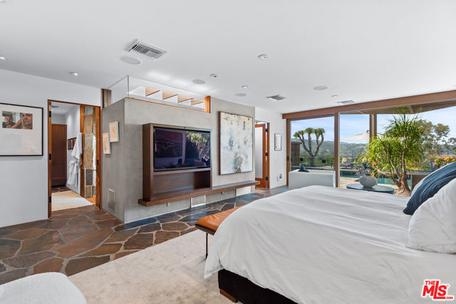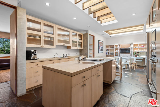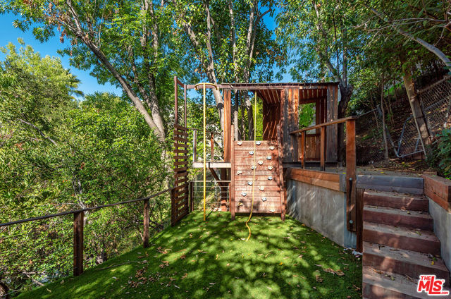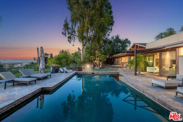 Tucked behind a sculptural concrete wall in Encino's coveted Royal Oaks enclave, this striking residence is a masterwork of California Mid-Century Modern design reimagined with organic and contemporary influences. A private courtyard with a burbling fountain sets a tranquil tone, while open living spaces showcase exquisite craftsmanship, natural textures, and refined simplicity. The living room's soaring exposed-wood vaulted ceiling crowns a wall of glass that highlights the home's effortless indoor-outdoor flow. The primary suite serves as a serene, Zen-inspired retreat, while its spa-like bath is a study in natural luxury featuring warm wood accents, hand-set stone walls, a skylit rain shower, and a deep soaking tub. Beyond, an architectural landscape of flagstone terraces, olive trees, and sculptural plantings unfolds to reveal sweeping canyon views. The expansive Ipe deck offers built-in seating, an outdoor kitchen, and seamless flow to a stunning stone-framed pool with an adjacent cold plunge. A glass-enclosed sauna with panoramic views and a secret treehouse nestled among mature trees complete the property's resort-like atmosphere an inspired fusion of design, nature, and quintessential California modern living.
