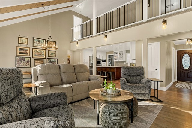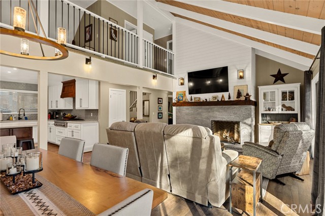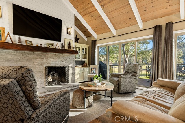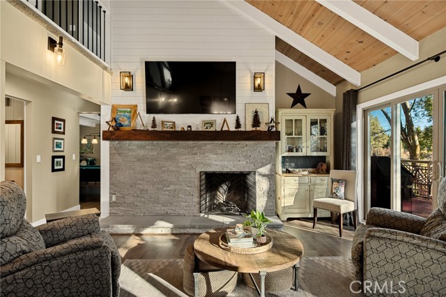 Located on one of Lake Arrowhead’s most desirable streets, this exceptional home sits on a quiet and private cul-de-sac along the front nine of the golf course. A circular driveway, level-entry access, and an expansive flat front yard create a rare and welcoming arrival. Nearly the entire home has been thoughtfully remodeled with elevated finishes throughout, including the addition of a tankless water heater and whole-house generator for comfort and peace of mind. Formal entry featuring a newly remodeled powder room, opening into a stunning two-story main living space with white-painted tongue-and-groove ceilings and exposed beams. Walls of oversized sliders flood the home with natural light and showcase sweeping golf course and lake views. The living room is anchored by a striking half-stack stone fireplace with a one-of-a-kind natural wood log mantel and shiplap detail above. The open-concept dining area easily accommodates eight or more guests and flows seamlessly into the newly remodeled kitchen, complete with custom knotty alder hood and island cabinetry, custom-painted cabinets, Fantasy Grey countertops, and a designer backsplash. Just beyond the kitchen, a newly added approximately 200-square-foot mudroom provides an ideal transition from the garage and includes laundry, pantry storage, and a functional workspace. On the opposite side of the main living area, a spacious game room offers a cozy seating area with its own fireplace, bar, and an expansive space perfect for billiards, arcade games, and entertaining. The primary suite is conveniently located on the main level and opens directly onto the deck, offering tranquil golf course views from bed. Spa-like ensuite features dual vanities, a large custom walk-in shower with rain shower head, wall and handheld fixtures, body sprayers, and a built-in bench, along with a generous walk-in closet. Outdoor living is exceptional, with expansive composite decking spanning the entire length of the home and stairs leading down to a flat yard and direct golf course setting. Positioned on the 8th fairway, the property enjoys views of multiple holes and three lakes. Upstairs, guests enjoy private accommodations on each side of the home, featuring oversized bedrooms with large closets, a centrally located bathroom, and a comfortable loft sitting area. A rare combination of privacy, level entry, extensive remodeling, modern systems, and premier golf course and lake views—this is Lake Arrowhead living at its finest.