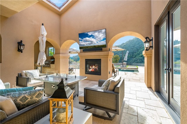 As the seller prepares for an upcoming corporate relocation, the home has been newly repositioned, creating an exceptional buying opportunity in one of De Luz’s most desirable settings. Located approximately 20 miles from the Pacific Ocean, this exquisite property seamlessly blends sophistication with the tranquility of its surroundings, creating a captivating, welcoming & serene retreat. Enter through private custom gates to cool breezes, on this 3.3 acre estate. Landscaped grounds lead to an architectural masterpiece that effortlessly marries contemporary design with timeless charm. Upon entering this Mediterranean Tuscan the foyer unveils the impeccable craftsmanship & meticulous attention to detail. The open floor plan bathes the interiors in natural light, accentuated by the high ceilings & Versailles laid travertine floors, complemented by wood floors in the bedrooms. The gourmet kitchen is a culinary haven where functionality meets aesthetics. Custom cabinetry & high-end Decor appliances, including a built-in refrigerator, microwave, warming drawer, dishwasher, undercounter ice maker & a 48-inch built-in 7-burner cooktop with dual ovens. The residence boasts spacious living areas, including a cozy family room with a fireplace for unwinding after exploring nearby wine country. A private office space caters to modern lifestyle demands & can easily convert into a 4th bedroom. The master suite is a haven of luxury, featuring a dual-sided fireplace, a private sitting area & a spa-like bathroom that beckons for relaxation. There are 2 more bedrooms each w/ensuite baths. Stepping outside through accordion glass doors, merging indoors with the outdoor seating, fireplace, outdoor kitchen & bathroom, creating the perfect setting for al fresco entertaining. The saltwater pebble pool, equipped with a retractable cover & a spa accommodating 20 people promise ultimate relaxation. Beyond the pool, a bocce ball court with its crushed oyster shell playing field, providing a unique & engaging recreational space. The property features a small orchard with a variety of fruit trees, while the expansive yard boasts drought-tolerant landscaping with native plants & trees. Multiple areas could serve as a location for an ADU or additional agriculture. This property invites you to experience the epitome of gracious living in the heart of Temecula's scenic beauty. Welcome home to a lifestyle of sophistication & serenity.