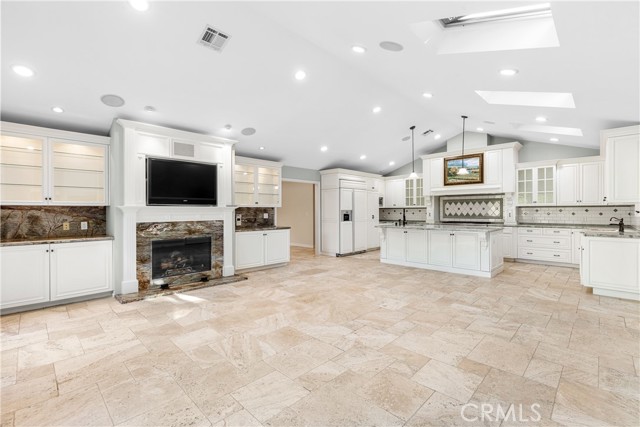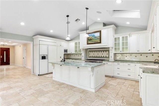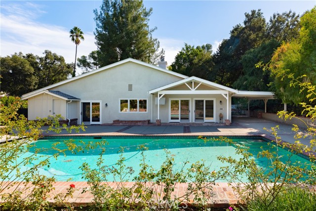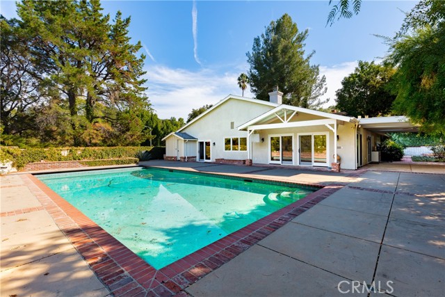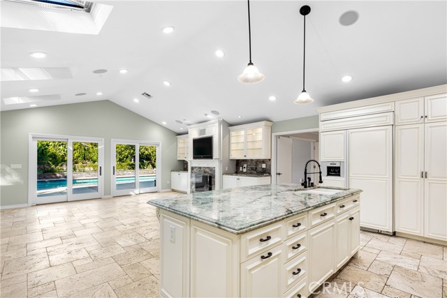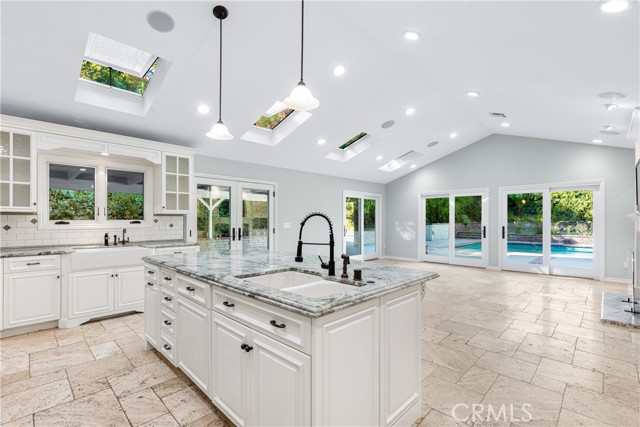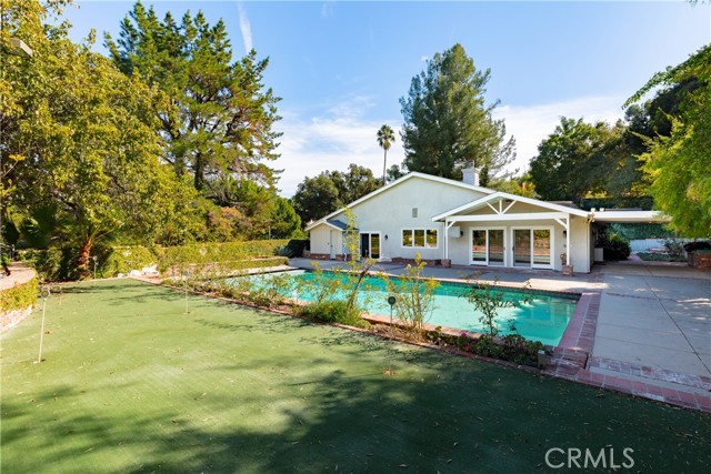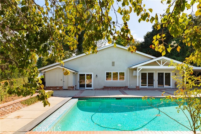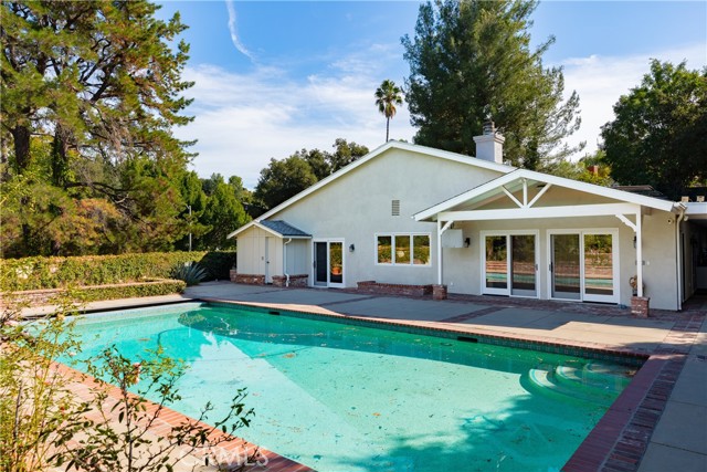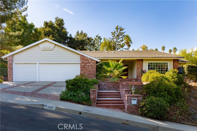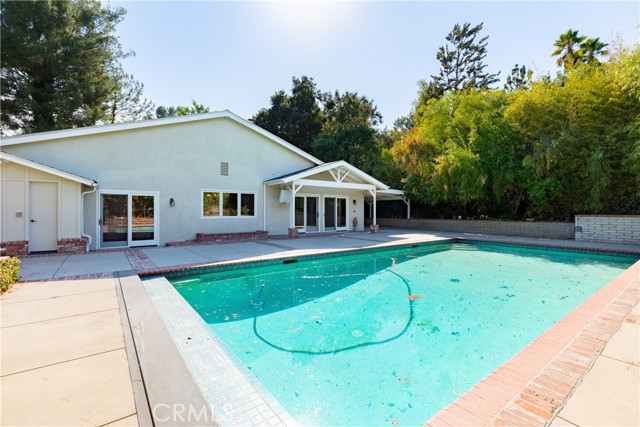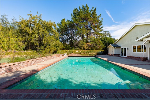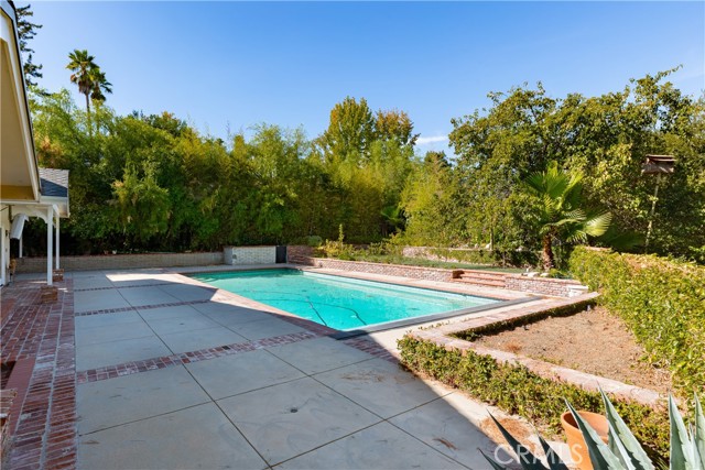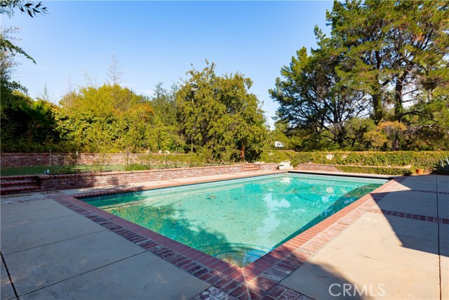 Set above the street on an exclusive cul-de-sac in Encino south, is this remodeled 4BR Traditional gem. Spanning a lot incorporating over 17,000 sq ft per assessor, this amazing property is tailor made for entertaining. A large and bright foyer/gallery, ideal for art, greets you as you enter, and leads to a spacious step-down living room/media room, including wood floors, a built-in entertainment unit, and a picturesque French window. The oversized formal dining room features custom wood crown moldings and a built-in china cabinet with elegant wood and beveled-glass accents. The focal point of the home is the dramatic state-of-the-art skylit kitchen/family room, highlighted by a striking granite center island, an Italian tile backsplash, hand-done cabinetry, 2 sinks, and a Dacor commercial 6-burner range. The family room, overlooking the pool, has a vaulted ceiling, travertine floors, a marble fireplace, and maple wood-built ins. The luxurious primary suite provides dual vanities, a granite and mosaic shower, a spa tub and walk-in closet. All the secondary bedrooms are abundant in size and have mirrored wardrobes. The private and expansive back yard is comprised of a sparkling brick-laced Pebble Tec pool, green, multiple patios, and hill views. An added bonus is the 3-car garage with an array of built-ins. Minutes to Ventura Blvd and its many vibrant dining and shopping options.