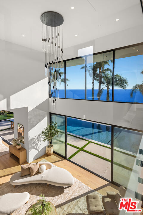 This newly built Malibu retreat offers resort style living with complete privacy and effortless indoor outdoor flow. A dramatic 24 foot glass gallery entry and open air atrium introduce the home's modern coastal design. The main level features an open dining and kitchen pavilion with a sculptural marble island, custom rift oak cabinetry, panel ready Thermador appliances, and pocketing walls of glass framing peaceful treetop and hillside views. The great room and adjoining bar lounge open to the infinity edge pool, with wraparound sliders capturing unobstructed ocean vistas. Just behind the bar sits a spacious bonus room ideal for a theater, game room, or entertainment space. A sleek fitness studio with its own en suite bath is located off the kitchen, creating a second large bonus space. The home offers four en suite bedroom suites and five baths, thoughtfully designed for comfort and privacy. Upstairs, the primary suite showcases floor to ceiling glass, pocket doors, and panoramic coastline views, along with a boutique style walk in closet and a spa inspired bath with soaking tub and dual vanities. All four suites include walk-in closets, and three enjoy private ocean view balconies. The grounds are tailored for relaxation and entertaining, featuring multiple terraces, flat grassy areas, lush landscaping for total seclusion, natural pathways, and an infinity pool that blends seamlessly into the horizon. Additional features include a detached garage and an oversized gated driveway with abundant parking. A rare combination of privacy, architecture, and coastal living perched above one of Malibu's most dramatic stretches of shoreline.