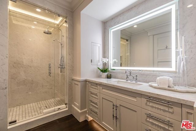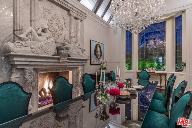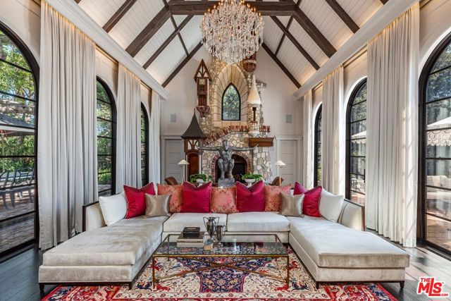 Spanning over 15,000 square feet on over 2 private acres, this estate sits within the gated enclave of Island Forest, surrounded by the fairways of North Ranch Country Club. A rare opportunity to own the residence of Melanie Taylor Kent, the celebrated artist best known as the first licensed by The Walt Disney Company to create limited-edition serigraphs of its iconic theme parks. it was later purchased by the current owner, who completed a meticulous 2.5-year, down-to-the-studs renovation. Step inside to find soaring ceilings, rich materials and curated living spaces that balance scale with comfort. The foyer features a dramatic installation of 1850s stained-glass panels sourced from a historic European church, chosen for their color, detail and artistry casting a prismatic glow across the entry. The primary suite is a private retreat with a sitting lounge and fireplace, a resort-style bath with sculptural soaking tub and large walk-in shower. A boutique dressing room with built-ins and a generous closet area. The five additional bedroom suites are equally luxurious, each with its own distinct layout, bespoke finishes and spa-quality en-suite baths. These guest suites rival those found in the finest resorts, offering both comfort and privacy for family and guests. A two-story elevator provides seamless access to both levels. Six additional powder rooms are strategically positioned to complement the home's flow and support effortless entertaining. The estate offers four kitchens: a chef's kitchen, prep kitchen, butler's kitchen and a full kitchen in the pool house. The chef's kitchen also includes a separate dining area, offering a comfortable space for informal meals or gathering during meal prep. The main living room features a walk-in fireplace and a built-in kitchen/bar, creating a warm and inviting environment ideal for entertaining. Additional spaces include a gym, temperature-controlled wine cellar, hair and makeup salon, library and a birds-eye writing nook. The movie theater features professional projection and sound. A dedicated entertainment room serves as the ultimate performance lounge, complete with a built-in stage ideal for private performances or live music. A billiards room with fireplace adds a casual gathering area and a sound-insulated podcast studio supports content creation, interviews or virtual meetings. These spaces offer function, privacy, and creative flexibility. Distinguishable highlights include 11 fireplaces (9 with Carrara marble mantels), 12 chandeliers on motorized hoists, wide-plank wood floors, a stained-glass ceiling in library, Perrin & Rowe fixtures, and custom cabinetry. Tucked within its own oak-shaded enclave, the pool and spa feel like a hidden retreat surrounded by towering trees that filter golden light and lend an air of serenity. Designed for resort-style enjoyment, it includes waterfalls, a winding lazy river, and an elevated spa at its center. A custom slide is built into the hardscape. The grounds also include outdoor dining and lounge spaces, plus a full pool house with kitchen and living area, perfect for indoor-outdoor lifestyle.Other features include a pickleball court with a covered lounge and fireplace, lush landscaping and multiple fruit trees. Features dedicated parking for 10 cars, complemented by additional abundant guest parking. Behind the scenes, the home is equally well-equipped. A Nice Home Management system controls lighting, climate, shades, media, surveillance and pool/spa systems. Major upgrades include a DaVinci composite slate roof with copper turrets, custom steel windows and doors, 9 HVAC systems operating across 21 zones, and a dedicated control room centralizes all systems, ensuring seamless access for monitoring and maintenance. An estate of this scale, design, and quality is rarely available - offering a rare combination of architectural vision,