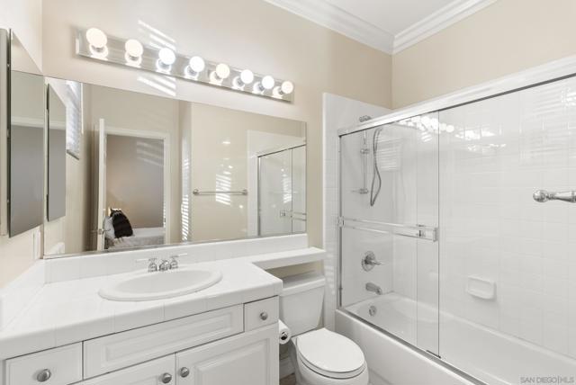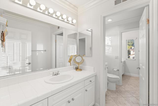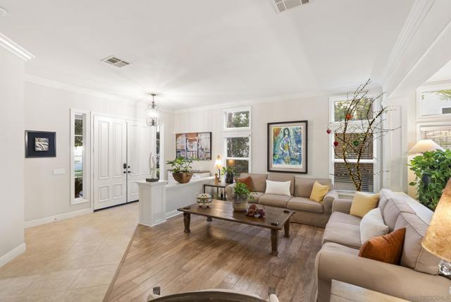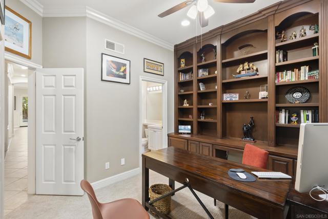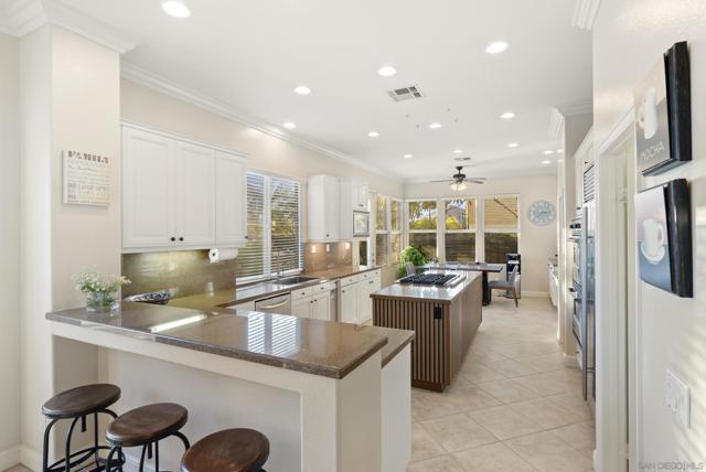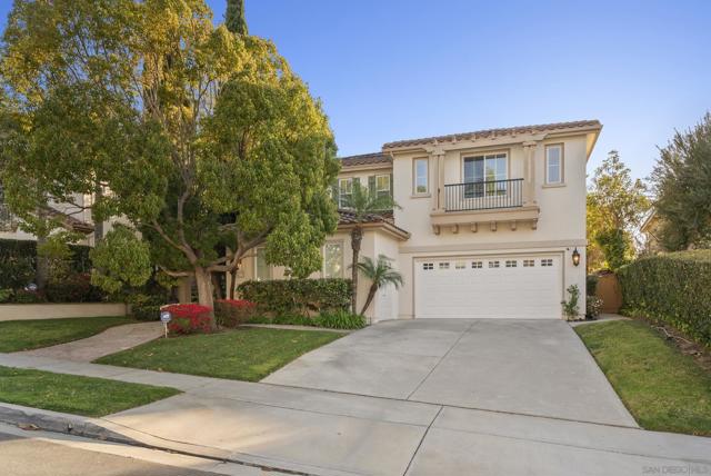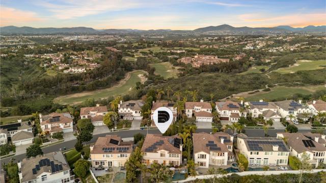 Perched above the Grand Del Mar, this 4,687-square-foot Lexington estate offers 7 bedrooms and 5 full baths of sophisticated living. The home greets you with soaring ceilings and abundant natural light. The formal entry leads to impressive formal living and dining spaces. A true chef’s kitchen with an island and dining area adjoins the inviting family room and flows effortlessly to the outdoor oasis. The rare main-level layout includes a full bedroom and bath, plus a dedicated office with its own full bath, perfect for guests. A grand staircase leads to a formal upstairs landing and a massive primary suite offering a sitting area, dual walk-in closets, and a spa-like bath with a soaking tub and dual-person shower. The second floor also hosts three additional bedrooms, two Jack-and-Jill baths, and an oversized bonus room with an adjoining balcony that easily serves as a seventh bedroom. Step outside to a private resort enjoying all-day sun. The backyard is an entertainer's dream with a heated pool, jacuzzi, breathtaking evening lights, and panoramic mountain views. A fully owned solar system powers both the residence and pool, allowing you to enjoy all at a low cost! Set in a meticulously maintained community with remarkably low fees, this estate is perfectly situated just minutes from Del Mar, freeways, shopping, restaurants, and top-rated schools. Whether enjoying a sunset from the balcony or exploring nearby canyon trails, this home delivers unmatched luxury and efficiency in a highly coveted zip code.