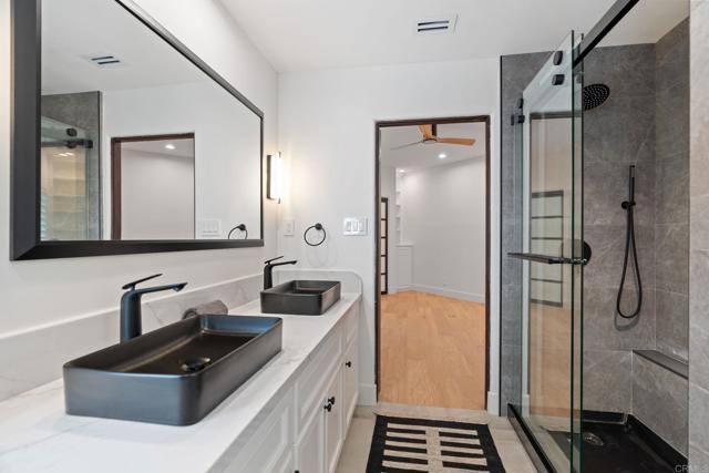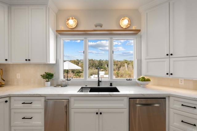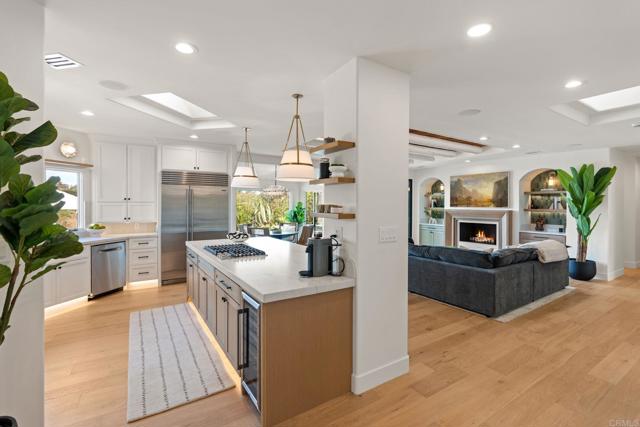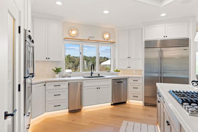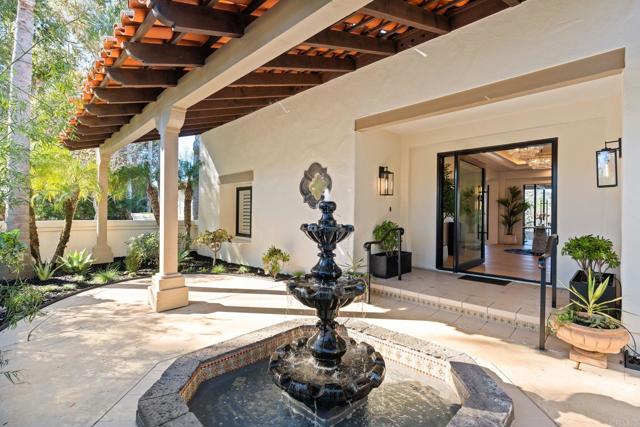 Located in the exclusive gated community of South Pointe Farms, this fully reimagined single-level modern estate captures western exposure, gentle ocean breezes, and sweeping views that set a serene tone throughout the home. Grand dual pivot doors open to wide-plank oak flooring, custom-beamed ceilings, designer lighting, and natural stone finishes that create a warm, elevated atmosphere from the moment you arrive. The chef’s kitchen features Sub-Zero and Viking appliances, a statement Mont Blanc quartzite island, and custom cabinetry, all flowing effortlessly into the great room and out through expansive multi-slide doors to the resort-style backyard. A dedicated theater room, refined home office, integrated sound system, LED ambient lighting, and brand-new framed art TVs make everyday living both simple and enjoyable. In addition, the fully-owned 76-panel 21kW solar system with two Tesla Powerwalls is a great asset providing significant energy cost savings. The primary suite offers a private retreat with direct outdoor access, a spa-like bath with marble shower and smart toilet, and an oversized walk-in closet. Each additional bathroom is finished with the same meticulous attention to detail. Outside, the newly rebuilt pool features natural-stone coping, PebbleTec finish, fresh plaster, and LED lighting. The outdoors include a pergola-covered living room, built-in BBQ, linear fireplace, and two custom water fountains, creating a true resort experience at home. Five indoor/outdoor fireplaces and new professional landscaping complete the setting. The property includes acreage that extends into the creek riverbed—a natural preserve filled with native plants, palms, and wildlife. This turn-key estate invites you to move in and immediately enjoy the best of Rancho Santa Fe living!