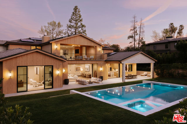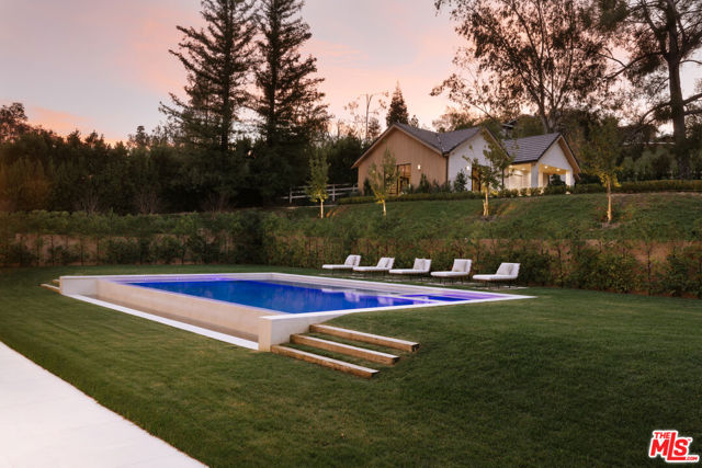 Tucked behind the gates of Hidden Hills, this modern estate unfolds like a private resort, offering over 16,000 square feet of effortless luxury. A dramatic entry and sculptural staircase open to expansive living spaces and a statement kitchen with dual waterfall islands, premium appliances, and a fully outfitted chef's kitchen. Glass walls slide away to reveal a resort-style backyard with a reverse infinity-edge pool, spa, fire features, intimate lounge areas, and a refined guest house. The primary suite is calm and indulgent with a private terrace, spa-inspired bath, and dual custom closets, while the lower level elevates daily living with a wellness-focused retreat featuring a fitness studio, theater, cocktail bar, game room, sauna, steam room, cold plunge, and massage suite. Private, polished, and impeccably executed, this is luxury living at its highest level in Hidden Hills.