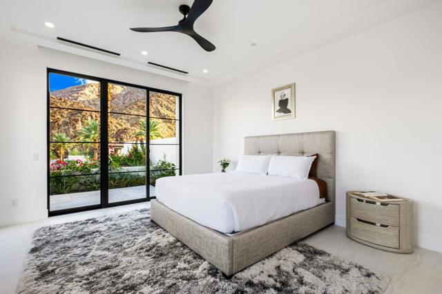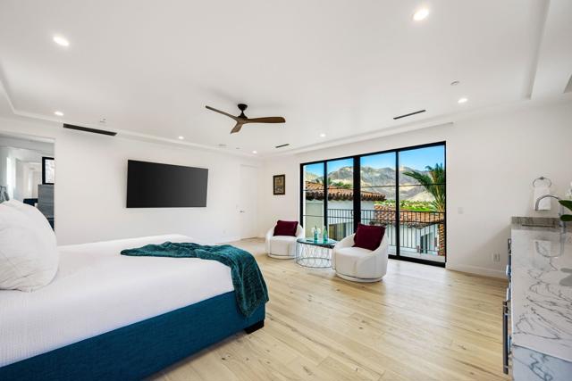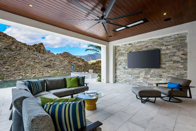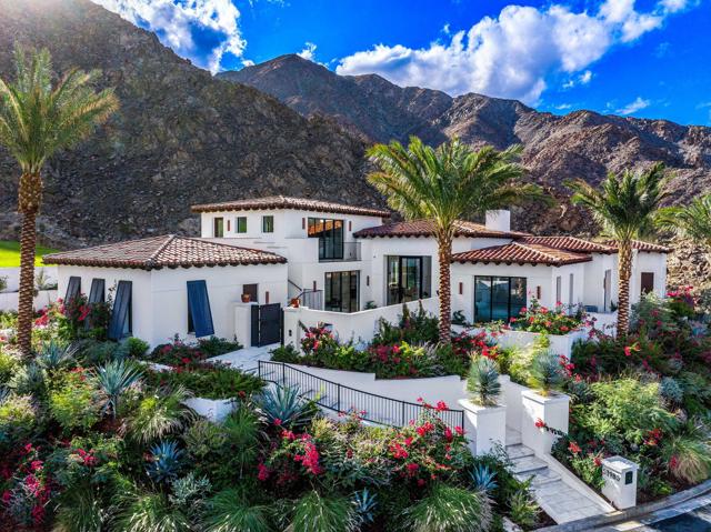 At Tradition in La Quinta. Fully completed, dazzling new construction. Unequalled, top-of-the-hill location. Spectacular mountain scenes in all directions feature eye-opening overlook and cross-valley vistas. A 5,550 SqFt architectural masterstroke--4-bed/4.5 bath/office/den--53985 Del Gato Drive is a rare, classic-contemporary residence perfectly nestled among naturally sculpted, millennia-aged stone. The stunning walkup and 12-foot, all-glass entry door invite; ideal layout, select materials, and unique details excite. Soaring ceilings throughout. A great room to actually live in. Pocket doors bring the outside in. Open and light, yet protective shade abounds. And the culinary kitchen with walk-in pantry sparkles in display of the finest fit & finish. A formal but welcoming dining room with custom wine wall promises the best of times. The dramatic, big-view primary suite with fireplace includes a lavish bathroom, well-appointed dressing room, and quietude bedroom to ensure deep rest. Two attractive secondary bedroom suites await. A comfortable den with adjoining study promote creativity and relaxation. An elevated yet spacious guest suite offers awe-inspiring panoramas. Precisely sited to capture the gorgeous rock-side effect, a sun-soaked infinity pool/spa with swim-up BBQ bar & firepit adeptly blend entertainment, style, and privacy. This one-of-a-kind property is ideal for the most discerning. Price includes 100K in Lutron electric blinds throughout, per buyer selections.