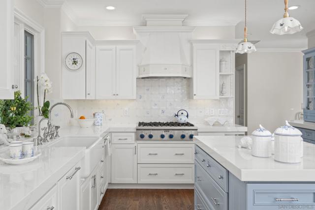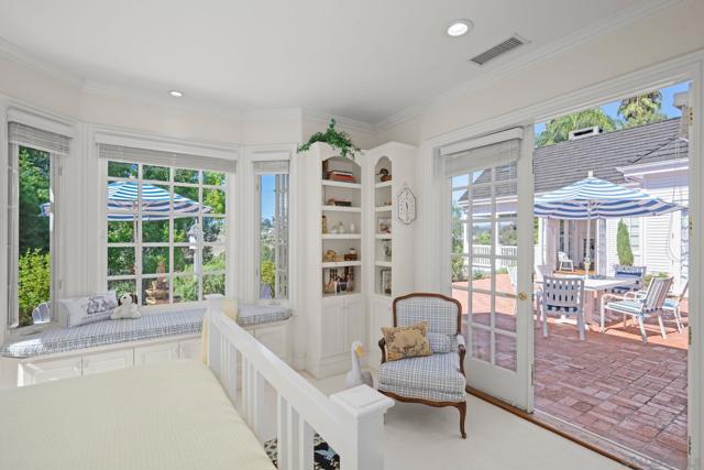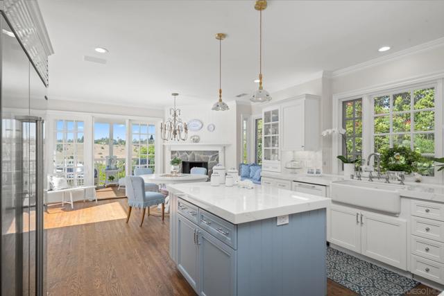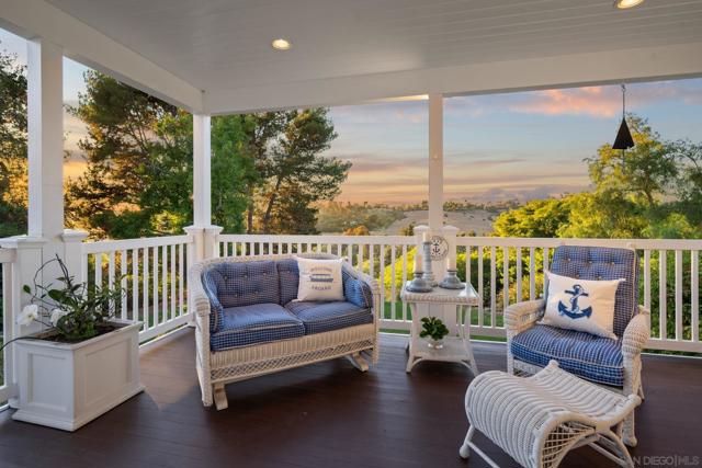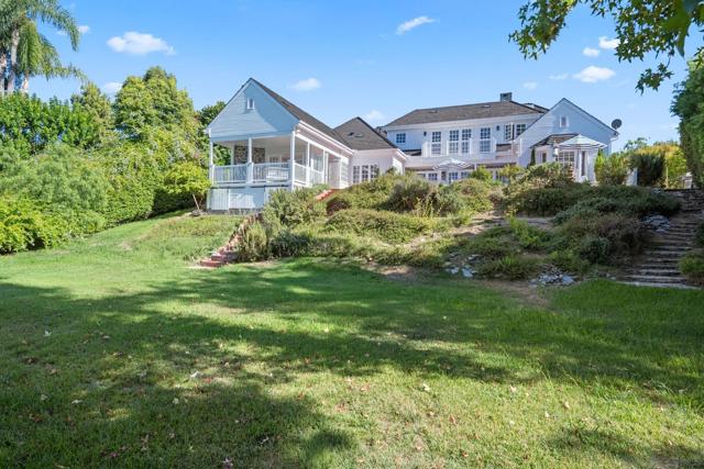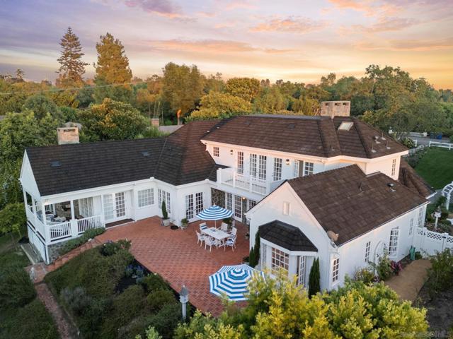 A perfect blend of timeless East Coast charm with relaxed Southern CA Living! The home is set on a generous usable lot with Panoramic Countryside Views & Sunsets, incredible gardens, and grass yard all delivering scale, privacy, and proximity to the Village, golf, beaches, and award-winning schools. The interior and exterior are full of generous "sun kissed" spaces with French doors that frame the entire back wall, inviting year-around indoor/outdoor living. The luxurious primary suite offers lovely vistas, large walk-in custom closet and grand spa bath with lovey views over the gardens. Each room offers total privacy and an incredible setting. The kitchen looks like a page out of Veranda Magazine and is equipped with Thermador, SubZero Refrigerator and Freezer, dual ovens, walk-in pantry, and large center island open to casual dining which flows seamlessly outdoors, where an expansive brick terrace, gardens, and covered loggia with fireplace extend living space year-round. The yard can easily accommodate a detached ADU with separate entrance for guests or family members. This property is so beautiful and unique ~ won't last long!