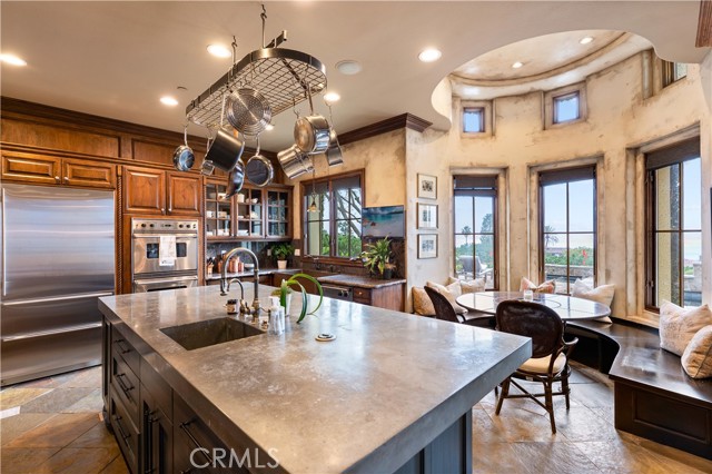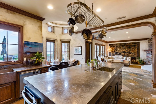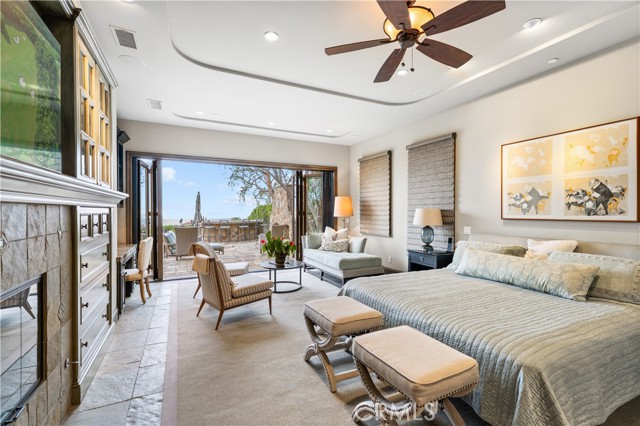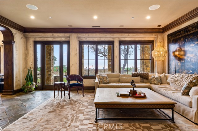 This exquisite single level estate is available for lease! Located in the coveted Crystal Cove neighborhood, the home offers panoramic ocean views from Laguna Beach to Palos Verdes. The Customized and Expanded floorpan has 4 bedrooms, 6 bathrooms, plus a home office with custom built-ins. The Piano sits within the formal living and dining room area complete with French doors and a fireplace. The Chefs kitchen includes a 6 burner Professional Viking range and griddle, Viking dishwasher, 2 sub zero refrigerators and freezers, wine cooler and an elaborate butler's pantry. The large zinc counter top island includes a new sink and fixtures. The expanded family room with fireplace offers ocean views, along with the primary suite with fireplace. The primary bathroom includes a steam shower/built-in tv, dual custom walk-in closets with built-ins. There is a 5 car heated garage with commercial grade 9'2" door, indoor basketball hoop, private bath, sub zero refrigerator, wired for electric car and a gym set up. The oversized secluded lot is nestled in the end of a private cup de sac, and includes succulent gardens, a private saltwater pool/spa, built in BBQ, retractable awnings and an outdoor fireplace. Available for lease December 2025 - May 2026.