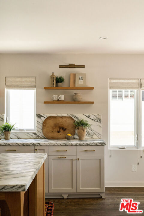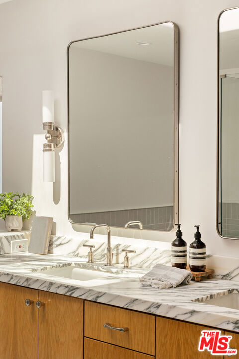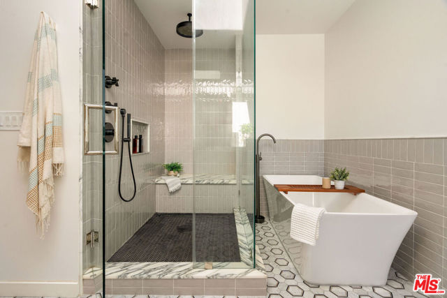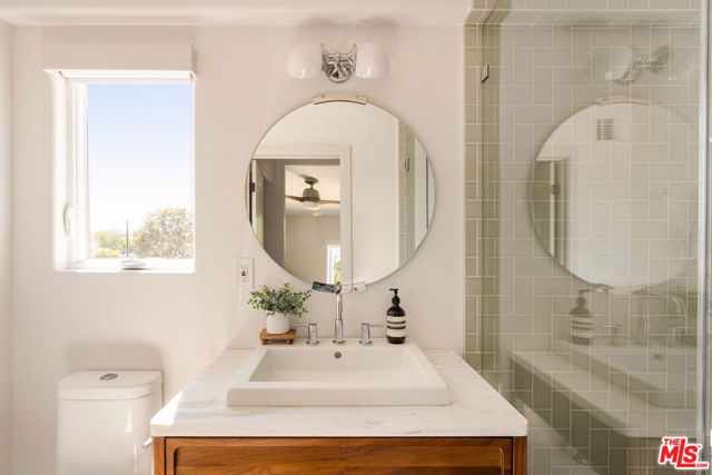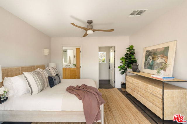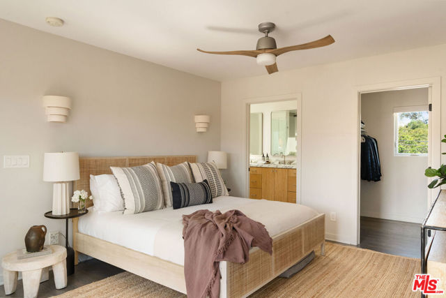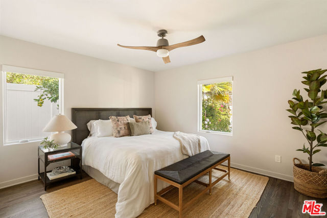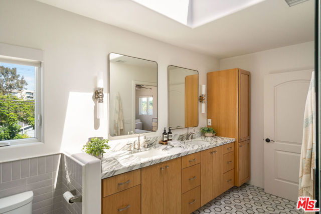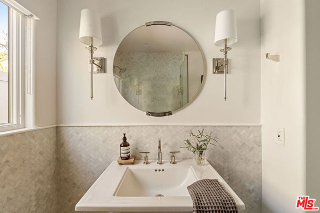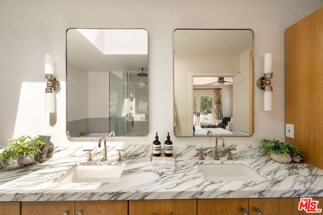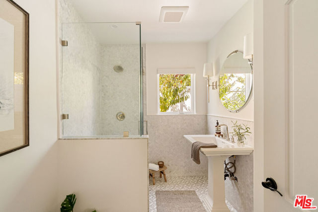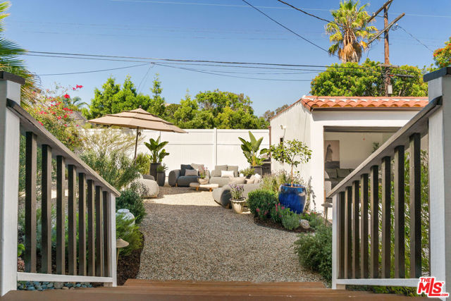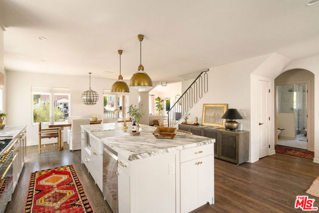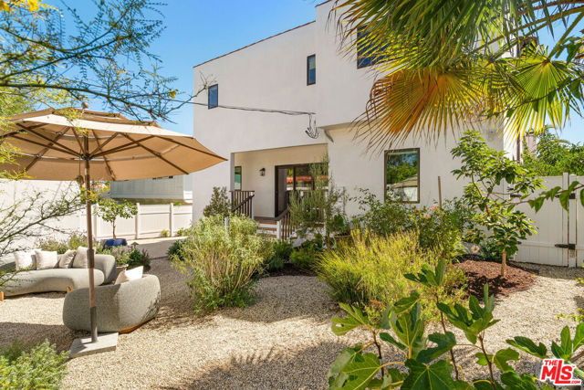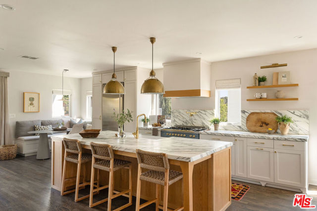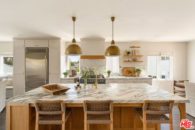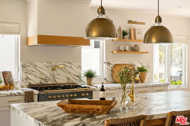 This Spanish-style Westchester residence was taken down to the studs and fully reimagined by a seasoned interior designer, completed in 2022 with impeccable attention to detail. Every space blends modern luxury with timeless character, a decorative fireplace, custom ironwork railings and hardwood floors. The chef's kitchen is a showpiece, featuring custom wood cabinetry with Rejuvenation hardware, Arabescato marble counters, and top-tier European appliances including an ILVE 40" range, brass pot filler, and Fulgor Milano built-ins. The spa-like primary suite boasts a double vanity with Arabescato marble, a freestanding soaking tub, and an oversized shower with Kallista rain fixtures. Designer window treatments and curated finishes throughout underscore the home's elevated design. Outside, drought-tolerant landscaping, automatic lighting, and citrus and fruit trees create a private backyard retreat. A finished garage with 200v EV charging outlet completes this turnkey offering. Ideally located on a quiet, welcoming street, just minutes from Playa del Rey, Playa Vista, Silicon Beach, and LAX, this home delivers a rare blend of coastal convenience, Spanish character, and true designer pedigree.
