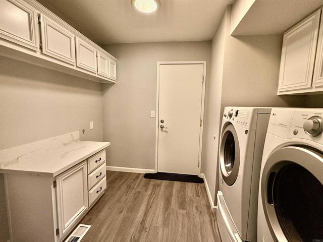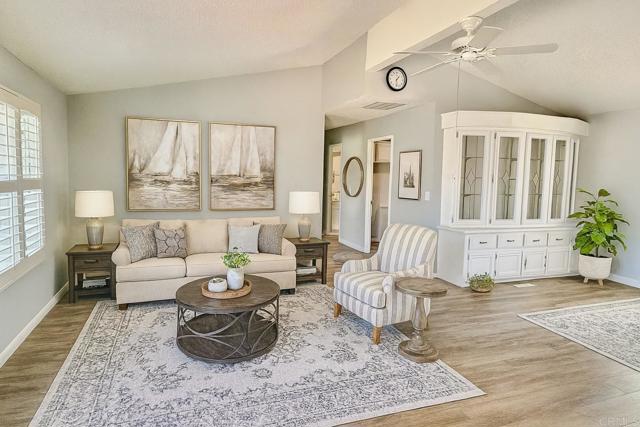 Remodeled 2 bed/2 bath Home with open floorplan, TROPICAL Yard and 2 Car Garage in active 55+ community! Primary suite includes spa like bath with abundant storage, dual sinks, tub/shower combo, and massive walk-in closet! 2nd bath designed for accessibility with walk-in shower, built-in chair, handrail grips, and bidet! Updated kitchen with QUARTZ countertops and crisp white cabinetry! Large dining area with built-in buffet. large living room flows seamlessly into a sunlit bay window area, perfect for relaxing or entertaining. You will love the huge laundry room with front loading LG washer and dryer! Step outside to enjoy lush tropical landscaping and a private outdoor living space, ideal for morning coffee or evening gatherings. Virtually staged. Call now! CAL353616