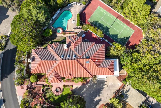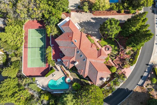 Experience the perfect blend of luxury, elegance & California living in this breathtaking Mediterranean estate. This residence offers unparalleled privacy & sweeping views of the San Francisco Bay & surrounding mountains. A long, gated driveway welcomes you setting the stage for the home's elegant interior. Step inside to a dramatic, light-filled foyer featuring a graceful winding staircase that leads into an expansive living room framed by floor-to-ceiling windows showcasing the spectacular views.The gourmet chef's kitchen is comes complete with a large center island, elegant stone countertops, & top-of-the-line Viking stainless steel appliances. A richly wood-paneled library/office & spacious formal living & dining areas add sophistication, while new double-pane windows enhance comfort & energy efficiency throughout the home.Upstairs a primary suite awaits, featuring a spa-inspired bath with a jetted soaking tub, alongside generously sized bedrooms offering comfort & privacy. The impeccably landscaped grounds create a true oasis, featuring a resort-style pool & spa, & private tennis court. Perfect for both relaxation & entertaining, this property offers an unmatched lifestyle in one of California's most coveted settings.