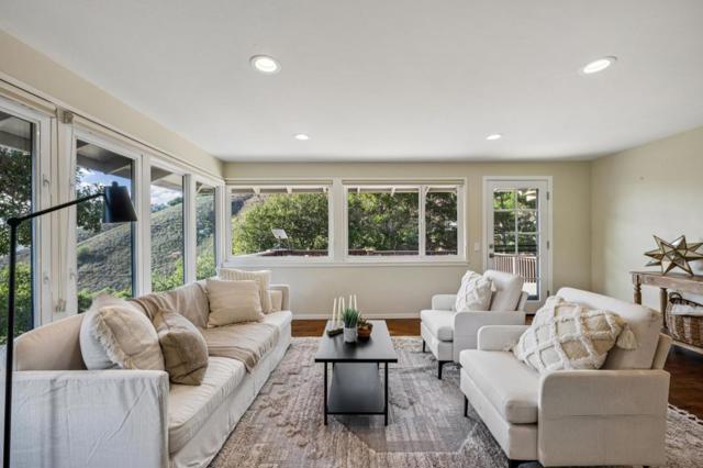 Serene living at this Carmel Valley retreat, offering panoramic southern facing, capturing the Santa Lucia Mountains and sunsets that resemble real life paintings. Four-bedroom, three-bathroom residence is designed to enhance the seamless indoor-outdoor lifestyle that the area's perfect climate provides. The gourmet kitchen opens to a sunlit patio, perfect for morning coffee and watching birds. The spacious living room with stone faced fireplace and dual sets of French doors leading to an extensive deck that takes in the views of the mountains as well as the gardens. The main floor features a lovely owner's suite, two guest bedrooms, and light filled reading room, all adorned with rich oak hardwood floors. The lower level boasts a private en-suite with its own entrance from the patio area. It connects to a flex space that is perfect for a home office or gym. The gardens are lush, filled with native drought tolerant plants that thrive in the valley climate, and garden beds that are bursting with the season's best all year. Conveniently located near the amenities of Carmel Valley Village, endless hiking trails of Garland Regional Park and just over 5 minutes from Mid-Valley. This residence offers an unparalleled lifestyle amidst lush gardens and tranquil surroundings.