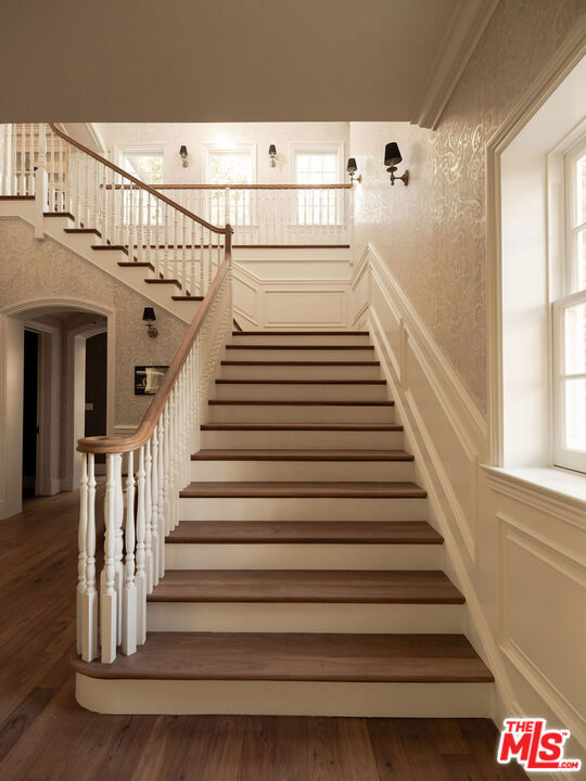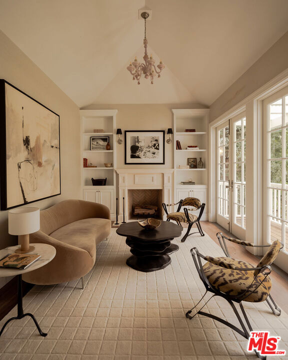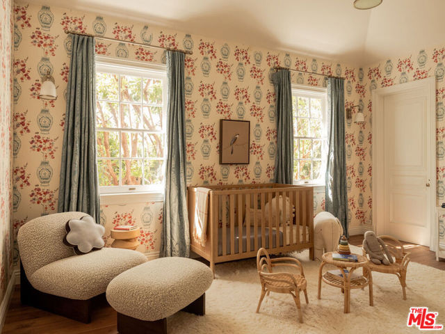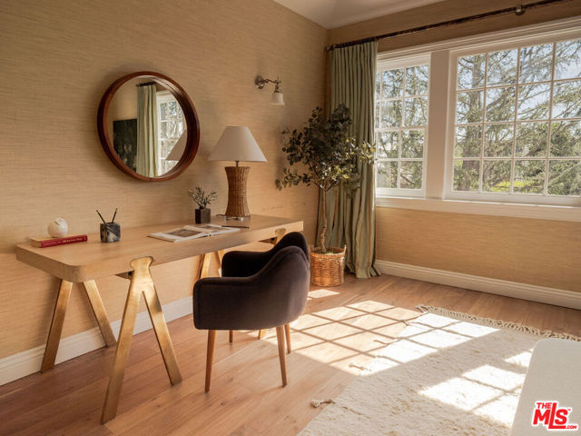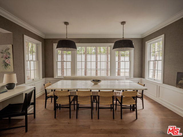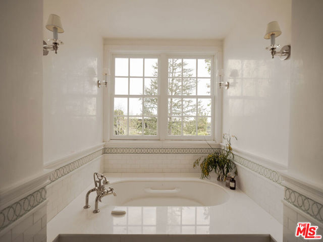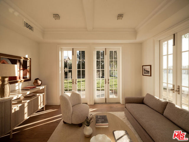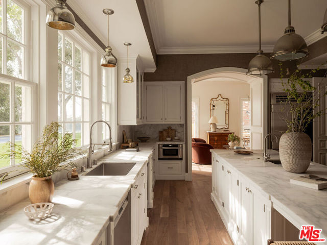 Gated and privately set in Pacific Palisades' coveted Lower Riviera, this gracious traditional estate offers the rare combination of privacy, scale, and elegance that defines life on the Westside at its finest. Perched above Rustic Canyon with mountain views stretching toward the horizon, the property sits on over 18,000 square feet of newly landscaped grounds. Surrounded by apple, lemon, and avocado trees, you feel a world apart while remaining moments from the coast, canyon trails, and the neighborhood's beloved dining and caf scene. Designed with the refined sensibility of Windsor Smith, this 7,500 square foot residence unfolds across an expansive floor plan. The formal living room anchors the main level - featuring high ceilings, a fireplace and rich architectural detailing. The foyer flows naturally into an airy dining room with a generous butler's pantry. The gourmet kitchen - appointed with Wolf and Sub-Zero appliances, opens to a cozy family room and breakfast nook. Making this property equally suited for both intimate dinners and large-scale gatherings. The primary suite is a private retreat: a dedicated sitting area, dual marble bathrooms, and dual closets compose a spa-inspired space. Five additional ensuite bedrooms, each with oversized closets and bespoke wallpapers - are complemented by an upstairs sitting room and reading nook. Additional amenities include a home gym, executive office, and a full-featured smart home system with Control4, Lutron lighting, Jandy pool controls, and integrated security. Outside, the estate is built for year-round California living: a resort-style pool and spa, a full outdoor kitchen with pizza oven and BBQ, an outdoor fireplace, and a two-story guest house. On one of the Lower Riviera's quietest streets, this is Pacific Palisades living without compromise.
