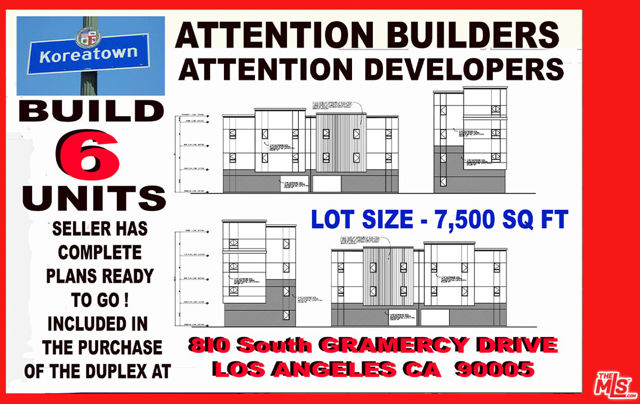 Beautiful Duplex on large LOT 7,500 SQ FT There are many beautiful improvements that have been done to both units. This Property is a " TRIPLE THREAT " Please Note .....BUYER # 1. Could be a Buyer looking for a Beautiful OWNER / USERr situation....Live in one unit and RENT out the other Unit for Income. $$$$.....BUYER # 2 Could be an Investor looking of a Great Investment Property in a PRIME KOREA TOWN LOCATION. with tremendous upside potential........Buyer # 3 Could be a BUILDER / DEVELOPER who wants to build 6 UNITS IN K TOWN. SELLER HAS COMPLETE PLANS to build 6 UNITS at this Location. Seller spent a HUGE AMOUNT of Money having these plans generated and will give them to the FUTURE BUYER, Please Note there is NO SIGN ON THE PROPERTY.......Please do not disturb the tenants . Call BOB with questions. Thank you
