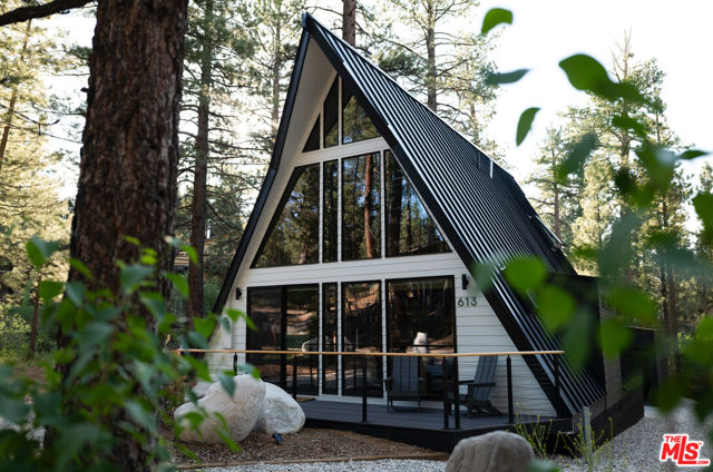 Tucked among the old-growth trees in the mountains of Big Bear, this striking Scandinavian retreat blends stone, hardwood, and thoughtful design into a truly one-of-a-kind alpine escape. Newly constructed and exuding extraordinary attention to detail, the property features two separate A-frame cabins, offering a rare combination of architectural beauty, flexibility, and peaceful mountain living. The main A-frame showcases a spacious design with soaring ceilings, clean lines, and an open, light-filled interior. Crafted from natural materials, the home pairs precision Baltic Birch walls with handmade Poplar end-grain floors, creating a warm and soulful interior that feels both modern and timeless. Large windows frame views of the surrounding forest, bringing in soft natural light during the day and moon lit trees by night. The central living area features dramatic vaulted ceilings and an open layout connecting the living, dining, and kitchen spaces, with a kitchen bar ideal for casual meals and entertaining. On the main level, a spacious guest bedroom sits alongside a beautifully finished British inspired wet bathroom featuring natural stone tile and a rain shower. A generous laundry and utility room offers the perfect place to drop skis, boots, and gear after a day on the slopes. Upstairs, a loft area provides additional flexible sleeping space, while the primary suite offers vaulted ceilings and a spa inspired bathroom, creating a peaceful retreat above the main living areas. A second A-frame at the rear of the property mirrors the concept design of the front home but with arguably more charm. With its own lofted bedroom, kitchen, and full bathroom, it is perfect for guests, extended family, or a private owner's retreat if the front cabin is used as a rental. Towering Jeffrey pines and native willows surround the seasonal creek behind the property, forming a natural privacy buffer that beautifully frames the A-frame homes and can be best enjoyed from the private back patio. This home has a spacious attached, heated garage with an elevated sleeping loft. Perfect for boat and activity storage, or convert to an additional living space with included utility hookups. Every element of this wall to wall hardwood mountain hideaway was intentionally crafted, creating a peaceful retreat where minimalist design meets Nordic alpine charm. Set in a quiet neighborhood at the end of the street, the property offers direct access to miles of serene forest trails. Despite its tranquil setting, the home is ideally located just minutes from ski resorts, outdoor recreation, local grocery stores, restaurants, and coffee shops.