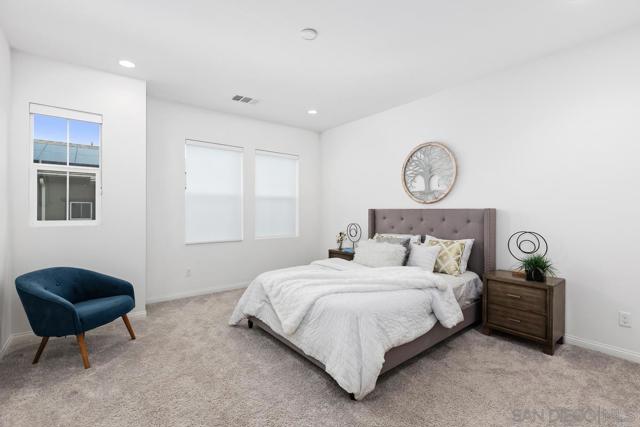 Seller is offering a credit toward an interest rate buy down! Move right into modern comfort with this nearly new, solar-powered townhome built in 2023. Set within a beautifully maintained community tucked in the serene hills near Sweetwater Reservoir, this spacious 3-bedroom, 2.5-bath, two-story home blends style and convenience at every turn. Step inside to an airy, light-filled layout that centers around a contemporary kitchen outfitted with a large island, breakfast bar, upgraded sink, and generous walk-in pantry. Wide-plank flooring on the main level pairs perfectly with fresh quartz countertops and a clean, neutral palette throughout. Bathrooms feature upgraded tile finishes for an elevated touch of design, while automated shutters add a sleek modern feel. The master retreat offers a spa-inspired bath for the ultimate escape. Situated in a private section of the complex yet conveniently just across the street from the community pool, this home offers the best of both privacy and accessibility. Enjoy scenic views of rolling hills and distant mountains from your private patio or upstairs windows. The inviting front courtyard welcomes you home, and the community’s resort-style amenities—including lush green spaces, swimming pool, BBQ area, and playground—make every day feel like a getaway. Conveniently located near parks, schools, and shopping for effortless living.