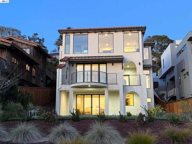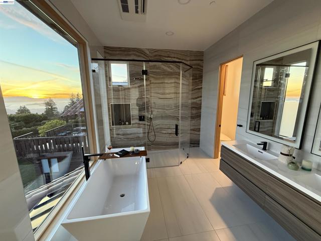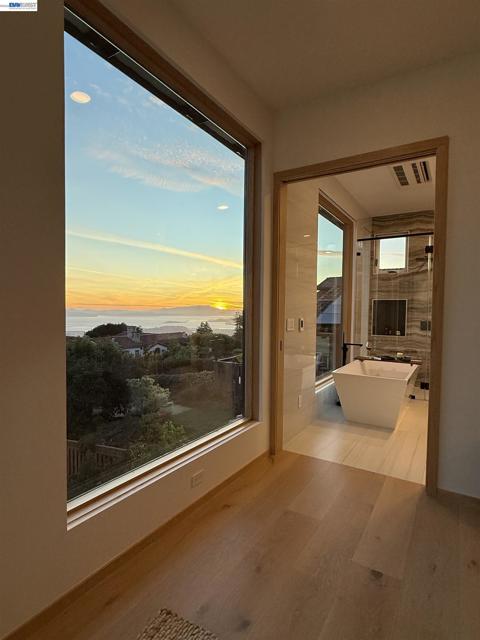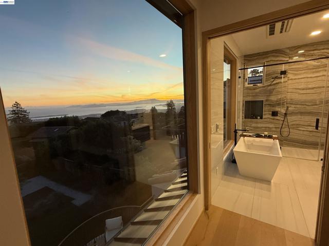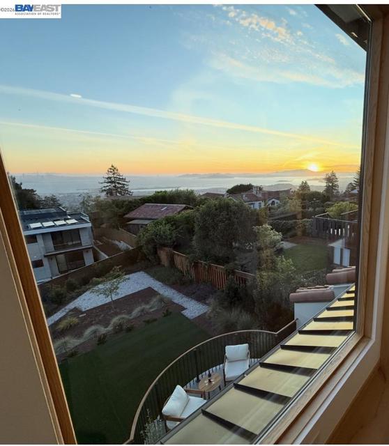 Recently built Berkeley Hills contemporary home with breathtaking panoramic Bay views and ADU. Set on a rare nearly 10,000 sq ft lot. Spectacular sunsets and sweeping vistas can be enjoyed from nearly every room. A dramatic skylight and glass-floor light well bring natural light from the roof through the upper level into the living space below, creating a striking architectural centerpiece and bright open interior. Nearly 12-ft ceilings and a folding glass door system open the living space to expansive decks framing spectacular Bay views. The chef’s kitchen boasts marble counters, Thermador appliances, and a walk-in pantry. Quality craftsmanship defines this residence, showcasing white oak and porcelain tile floors, customized rift oak doors, and top-of-the-line finishes throughout. The serene primary suite features large picture windows and a spa-like bath with radiant heated floors. Rare ~813 sq ft attached ADU with private entrance, full kitchen, living area, and separate meter—ideal for guests, extended family, or rental income. Additional highlights include AC, EV charging, smart switches, 1 GB fiber internet with wired connections in all rooms, a two-car garage, and extra driveway parking. Conveniently located near Albany and North Berkeley shopping, dining, parks, trails.