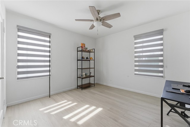 Ready to move-in! This beautifully charming home is ideally located in a great neighborhood, close to parks, schools, restaurants, shopping centers, and offers easy access to major freeways. The interior features laminated wood flooring throughout, a formal living room with a dining area, and multiple windows that bring in an abundance of natural light. Additional highlights include shutters and a unique painted glass window accent near the dining area. The updated kitchen is equipped with stainless steel appliances, including a dishwasher, and flows seamlessly into the main living spaces. Title reflects 3 bedrooms; however, the third room is currently utilized as a spacious family room with sliding glass doors that open to the kitchen area—perfect for entertaining or flexible living. The home also offers two generously sized guest bedrooms and an updated bathroom. Additional features include a convenient laundry area near the kitchen, central A/C, and water sprinklers. The long driveway leads to a detached rear garage with excellent potential for ADU conversion (buyer to verify). The expansive backyard includes a covered patio area and provides ample space to entertain family and friends or create your ideal outdoor retreat.