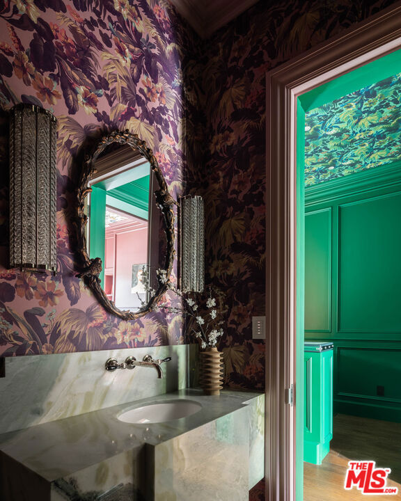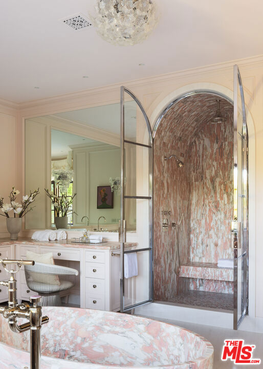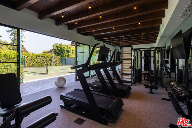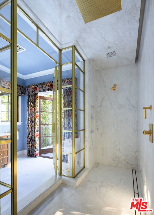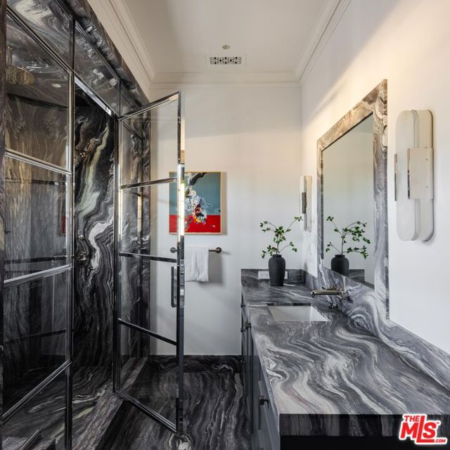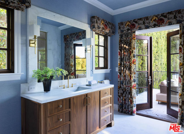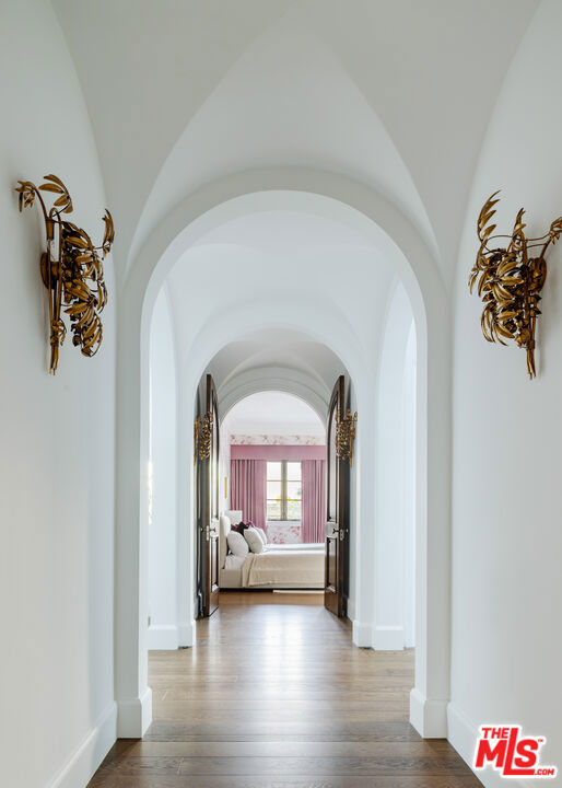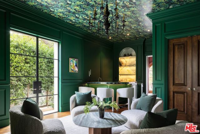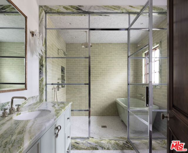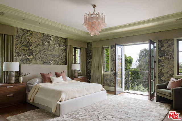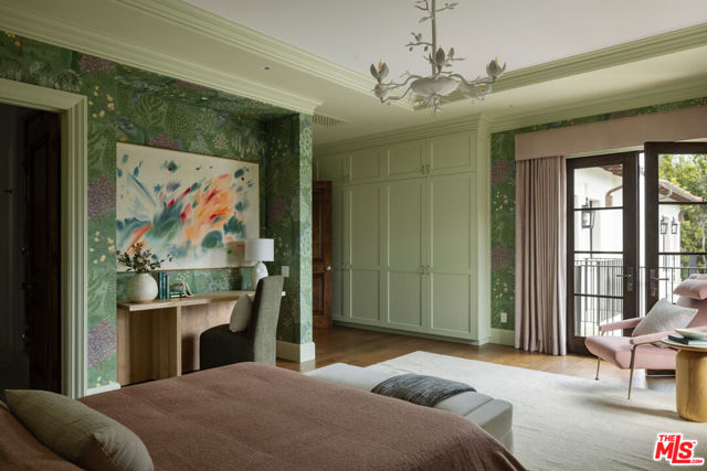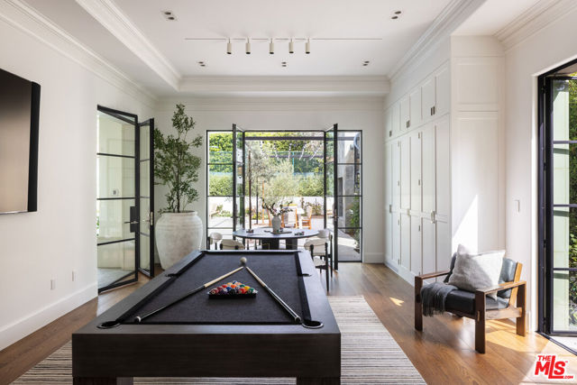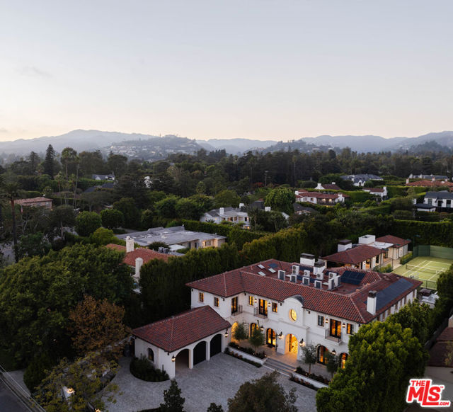 Behind the gates of a private cobblestone motor court in the heart of Brentwood Park stands The House of Hanover. Timeless European architecture reimagined through a contemporary lens this is the result of a three-year collaboration between AY Architects, Rattigan Construction, and Coppel Design. Spanning nearly 12,000 square feet entirely above grade, the residence reflects uncompromising craftsmanship at every turn. Dramatic ceiling heights and voluminous interiors unfold through a sequence of elegant spaces framed by arched passages, wide-plank wood floors, and black steel windows and doors accented with Nanz New York hardware. The Italian chef's kitchen crafted by Officine Gullo Firenze is a statement in precision and beauty, showcasing hand-finished stainless steel cabinetry, an eight-burner range, and Gaggenau dual ovens and refrigeration. Formal and informal living rooms, a pub lounge, game room, library and dining salon together create a seamless flow ideal for both grand entertaining and intimate living. Upstairs, five generous en suite bedrooms reveal an artful interplay of pattern and stone, featuring House of Hackney wall coverings and exquisite natural marbles. The primary suite is a private sanctuary with dual baths clad in Norwegian Rose marble and dual custom walk-in dressing rooms, each designed with couture-level detail. Beyond the main residence, the grounds evoke a private resort with a resort-sized pool with a Badu swim jet, lighted tennis court and a spectacular entertainer's pavilion complete with raised-beam ceilings and a commercial sized bar. Additional amenities include a detached professional gym with a full bathroom, state-of-the-art theater with a powder room, pool changing room with a 3/4 bathroom and an outdoor shower, and a full outdoor kitchen with a bbq and a pizza oven. The over sized three-car garage is lined with built-in storage. Throughout, every fixture and finish tells a story of connoisseurship: lighting by Paul Ferrante, Mechini, I Borbone and Murano chandeliers, plumbing by Sherle Wagner and THG, Crestron home automation for seamless comfort and effortless lifestyle. There is a solar system, Two Tesla car chargers, a Tesla battery generator plus a backup gas generator. The House of Hanover represents the rarest form of Los Angeles luxury, a one-of-one estate of timeless character and contemporary grace.