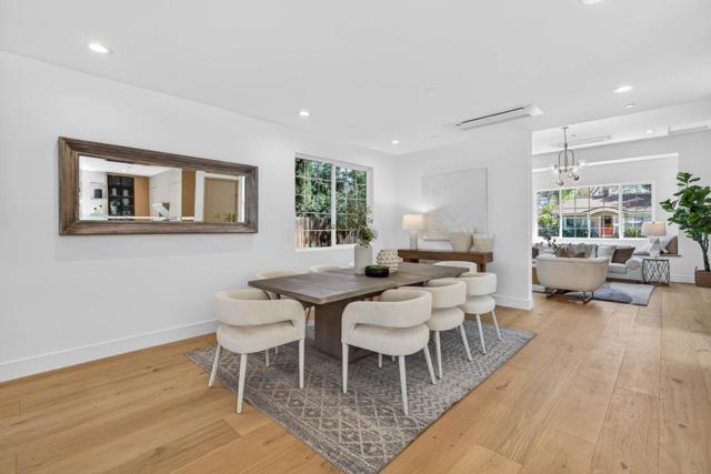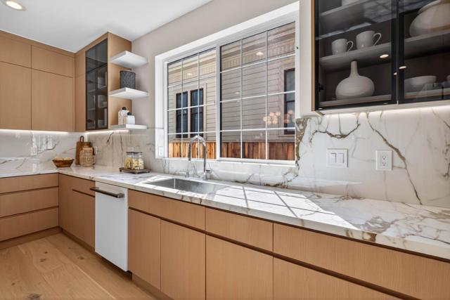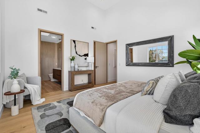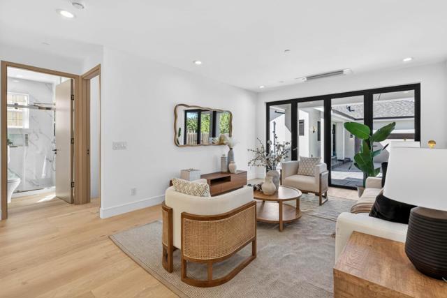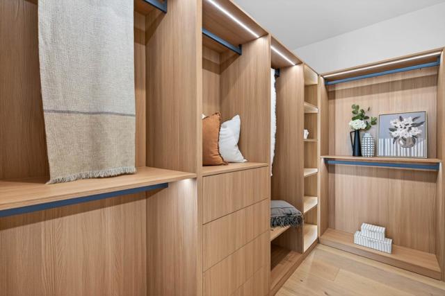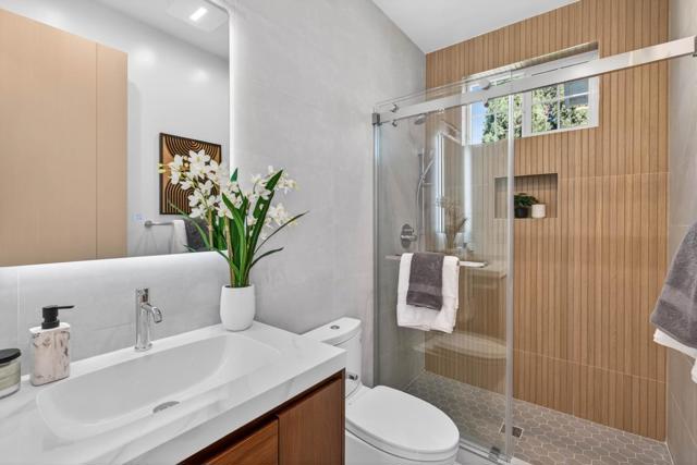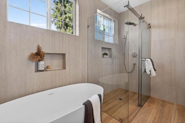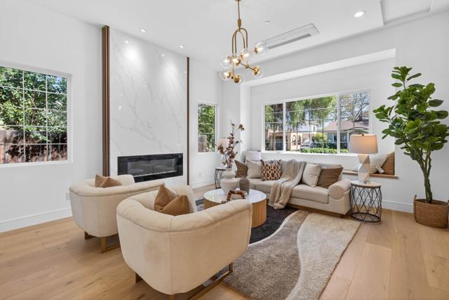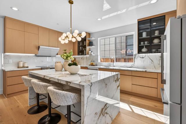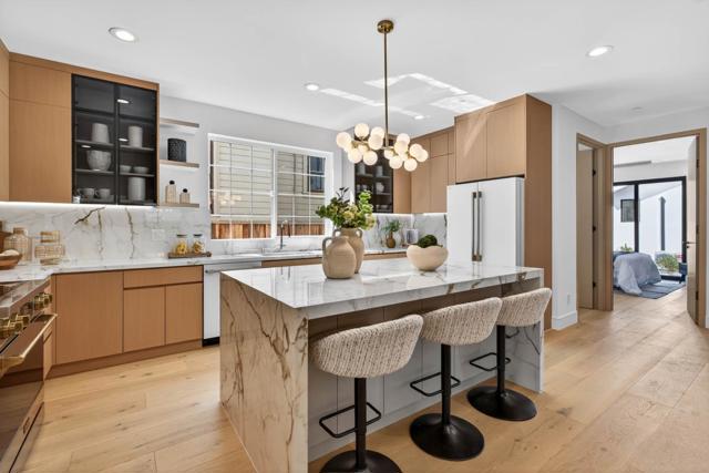 A brand-new modern home features a modern wood front door. Inside, open layout, engineered hardwood flooring, large picture windows, recessed LED lighting, linear slot HVAC diffusers, & modern interior doors. A custom built cabinetry & a fluted wood panel accent wall with integrated lighting. The living room has a modern linear fireplace with slab surround. The spacious open-floor plan family room, dining area & kitchen features an oversized waterfall-edge island, Imported Spanish porcelain countertop, 2-tone modern cabinetry with under-cabinet lighting, glass-front display cabinets, & stainless steel appliances: refrigerator, range with hood & LG dishwasher. Panoramic bifold glass doors. Bathrooms includes a frameless glass tile-surround walk-in shower with sliding glass door, shower niche, floating vanity, modern light bar, large-format accent tile walls, & TOTO toilet. A 2-story stairwell with large windows & designer chandelier leads to an open loft area with skylights. Bedrooms features custom cabinetry. The primary suite offers a high vaulted ceiling, while the spa-inspired primary bathroom includes a floating double-sink vanity, designer pendant lighting, skylight, freestanding soaking tub, frameless glass curbless walk-in shower, & Hansgrohe fixtures.