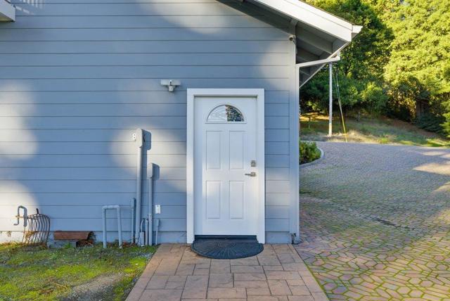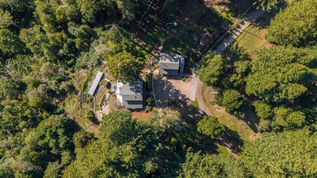 Elevated retreat at the end of a quiet court offering sweeping ocean and mountain views, privacy and a tropical hilltop setting featuring birds of paradise, leucadendron, pincushions, proteas, peonies. Approx. 4.7 acres, overlooking Monterey Bay and Pacific Ocean, sunsets galore. Main residence features 3 bedrooms and 3 bathrooms, approx. 2,171 sqft., with vaulted ceilings and abundant natural light enhancing the open layout. The renovated kitchen showcases premium Sub-Zero and Wolf appliances; bathrooms are thoughtfully updated with high-end finishes. Permitted 1-bedroom, 1-bath ADU 460 sqft. above the 3-car garage is ideal for guests, extended family, or rental income. Additional space could provide storage, gym, yoga studio, or office. Southwest exposure perfect for gardening the established gardens including orange, Fuji apple, Fuyu persimmon, peach, plum, fig, avocado, lemon, cherry, and apricot along with kiwi and grape vines. Relax in the swim spa with panoramic ocean views or go for a walk under the redwoods on the private hiking trails. Water tanks, solar, and backup generator support off grid independent living. Located about 25 min. to Aptos Village, beaches, and trails. Offering rare privacy, usable land, and breathtaking views within reach of everyday conveniences.